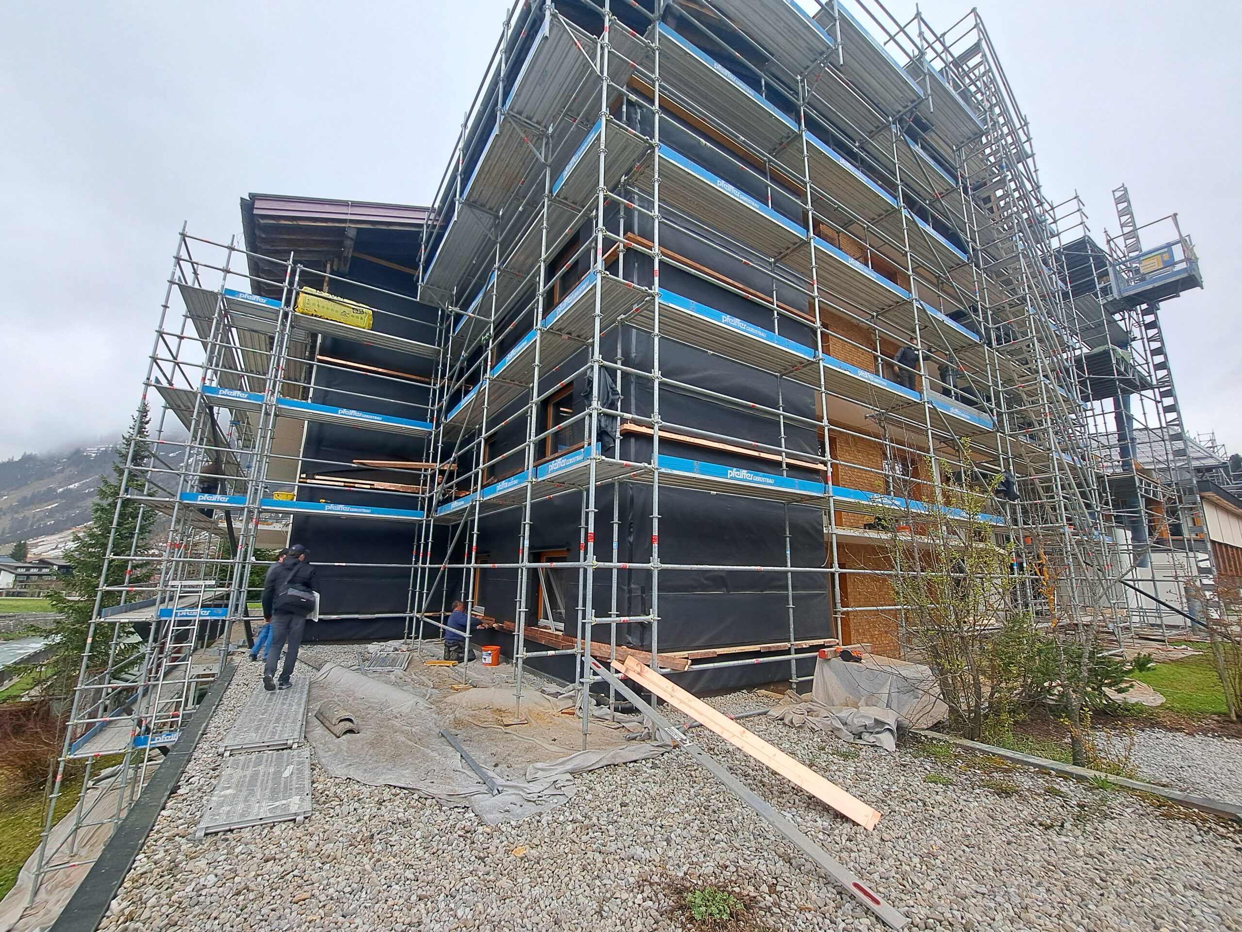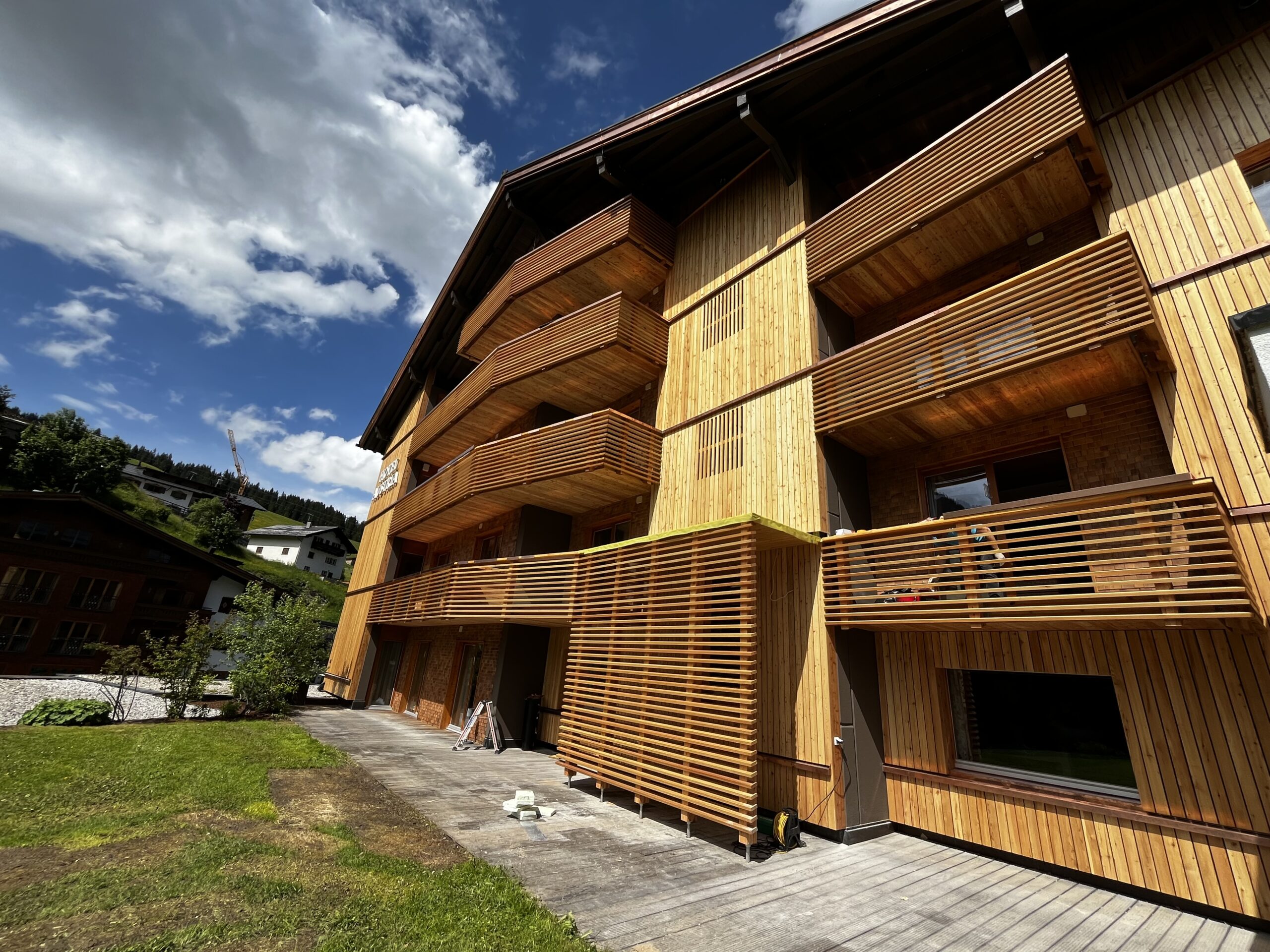 Thermische Sanierung der bestehenden Fassade und anbringen einer neuen Holzfassade in Lärche, Erneuerung und Erweiterung sämtlicher Balkone, Erweiterung des bestehenden Liftschachtes mit Brettsperrholzelementen