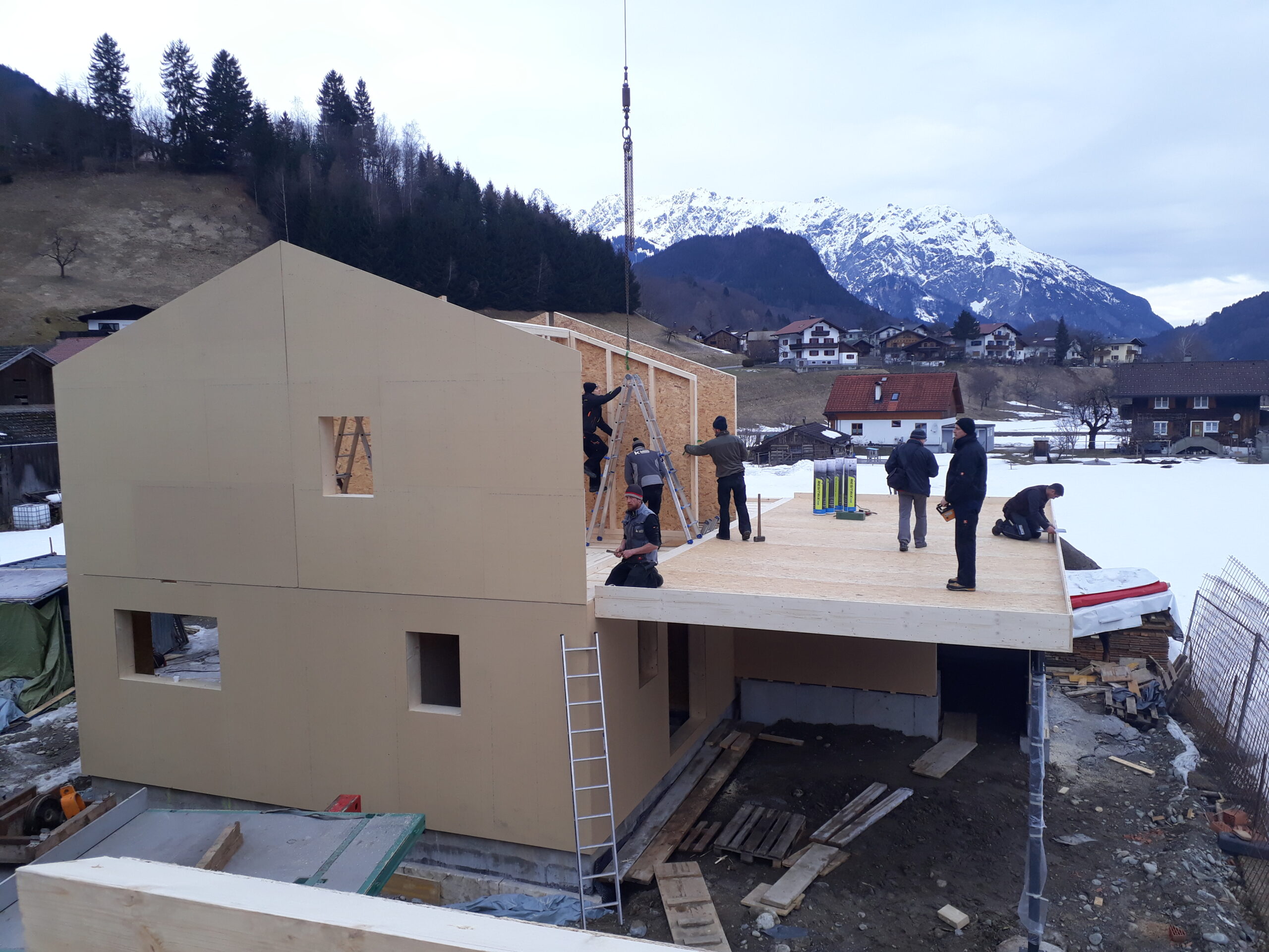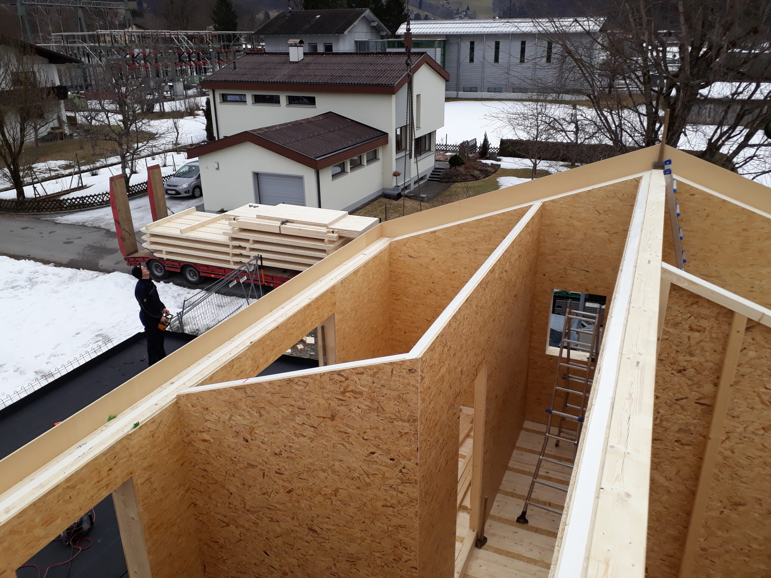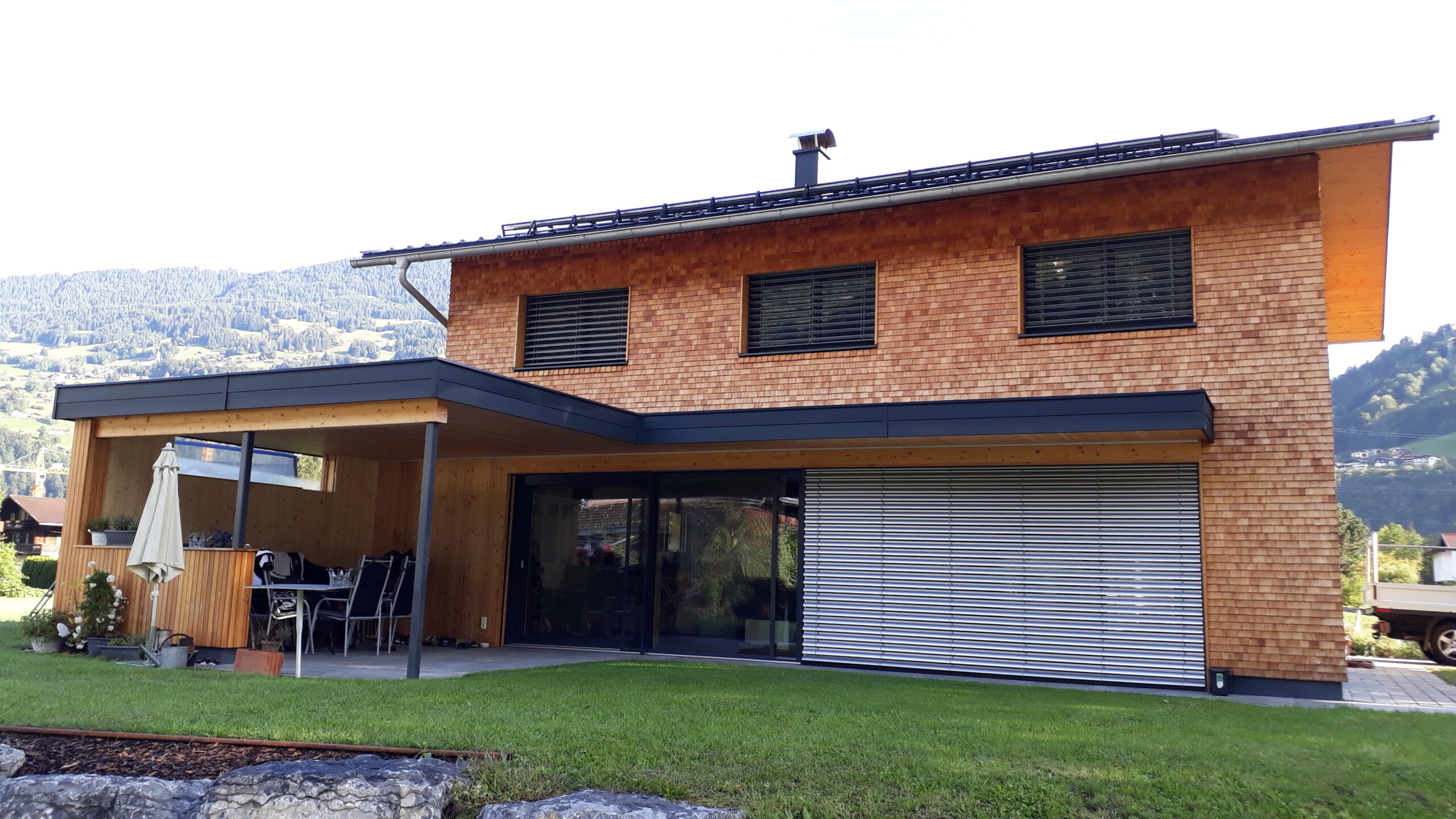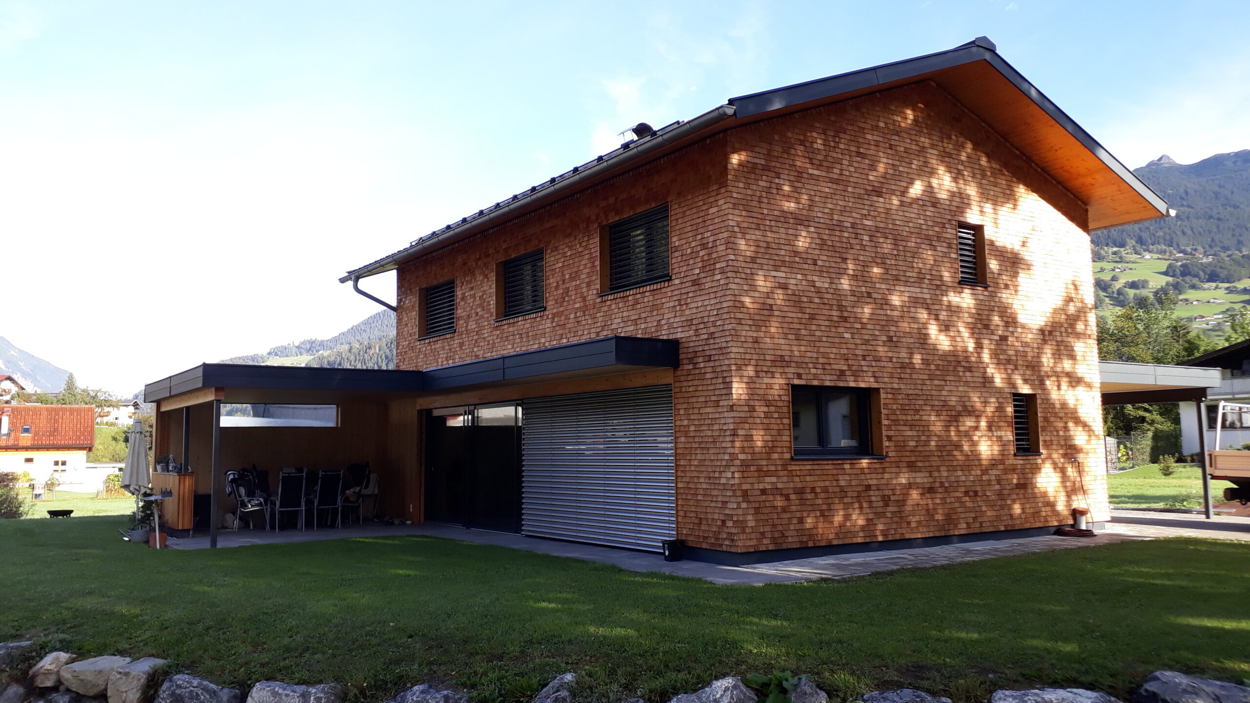 Untergeschoss in Stahlbeton, Erd- u. Obergeschoss in Holzelementbauweise, Zwischendecke aus BSH Deckenelementen Sicht, Dachkonstruktion aus BSH Deckenelementen Sicht mit Steildachdämmung, Schindelfassade