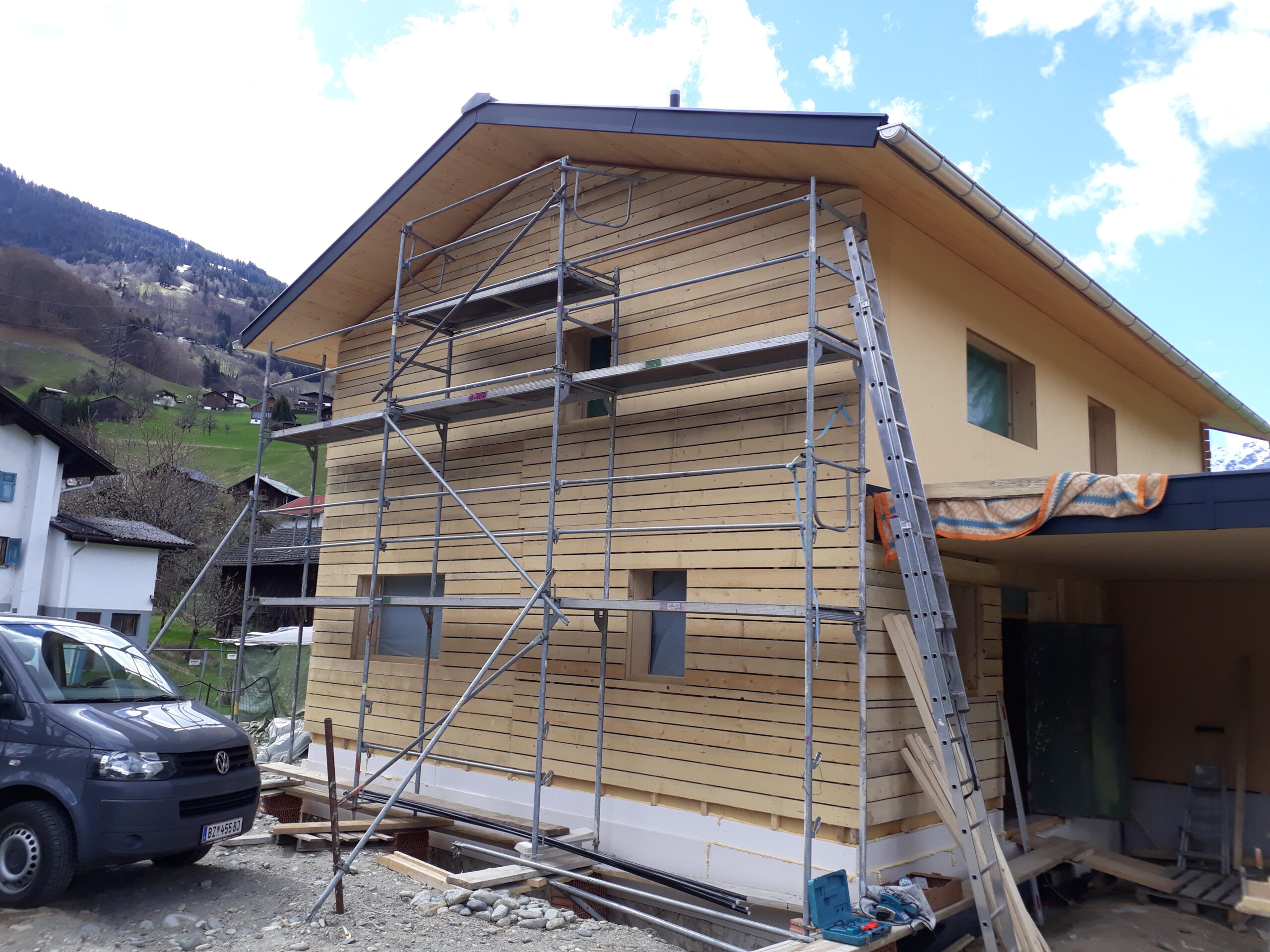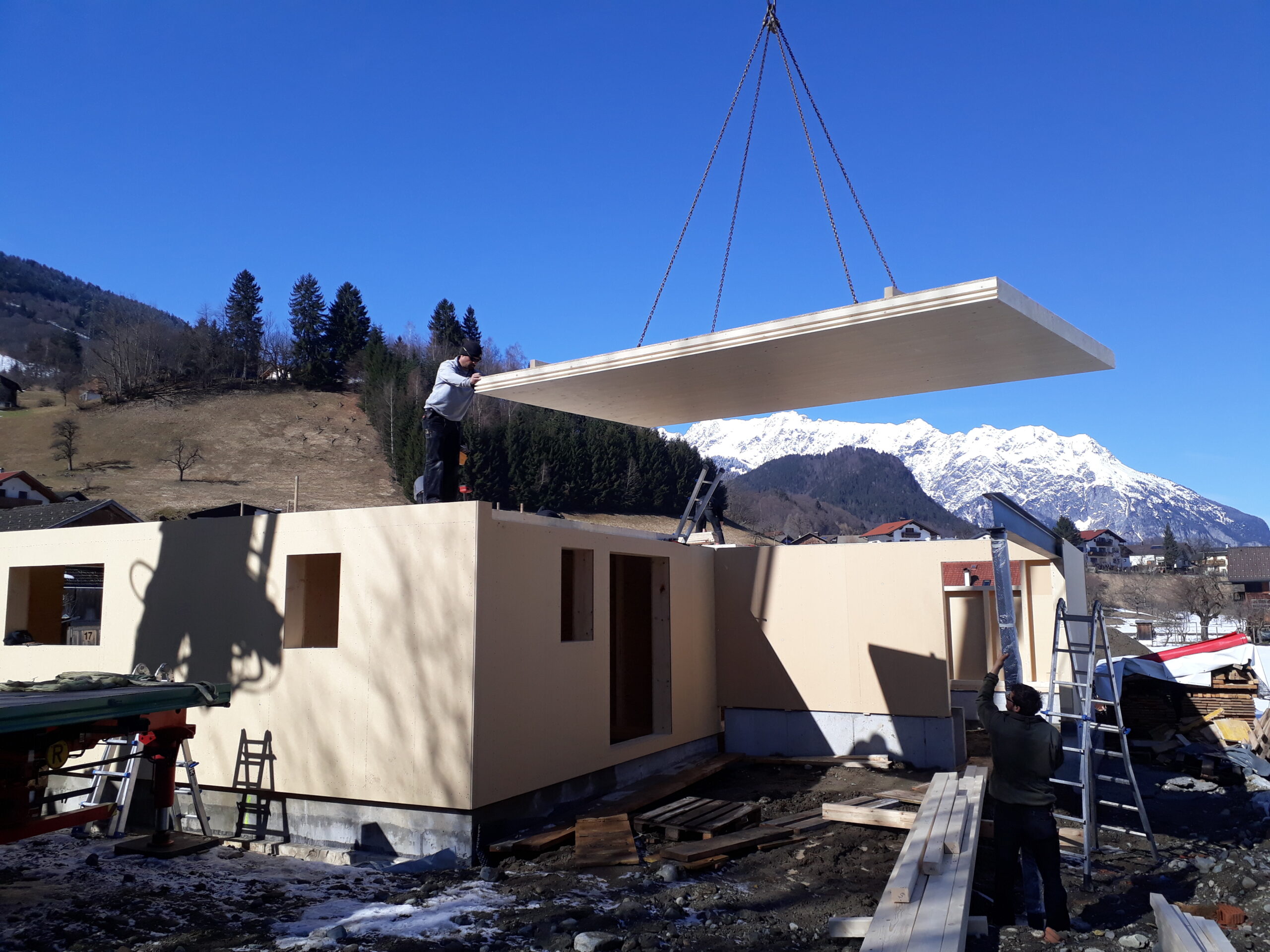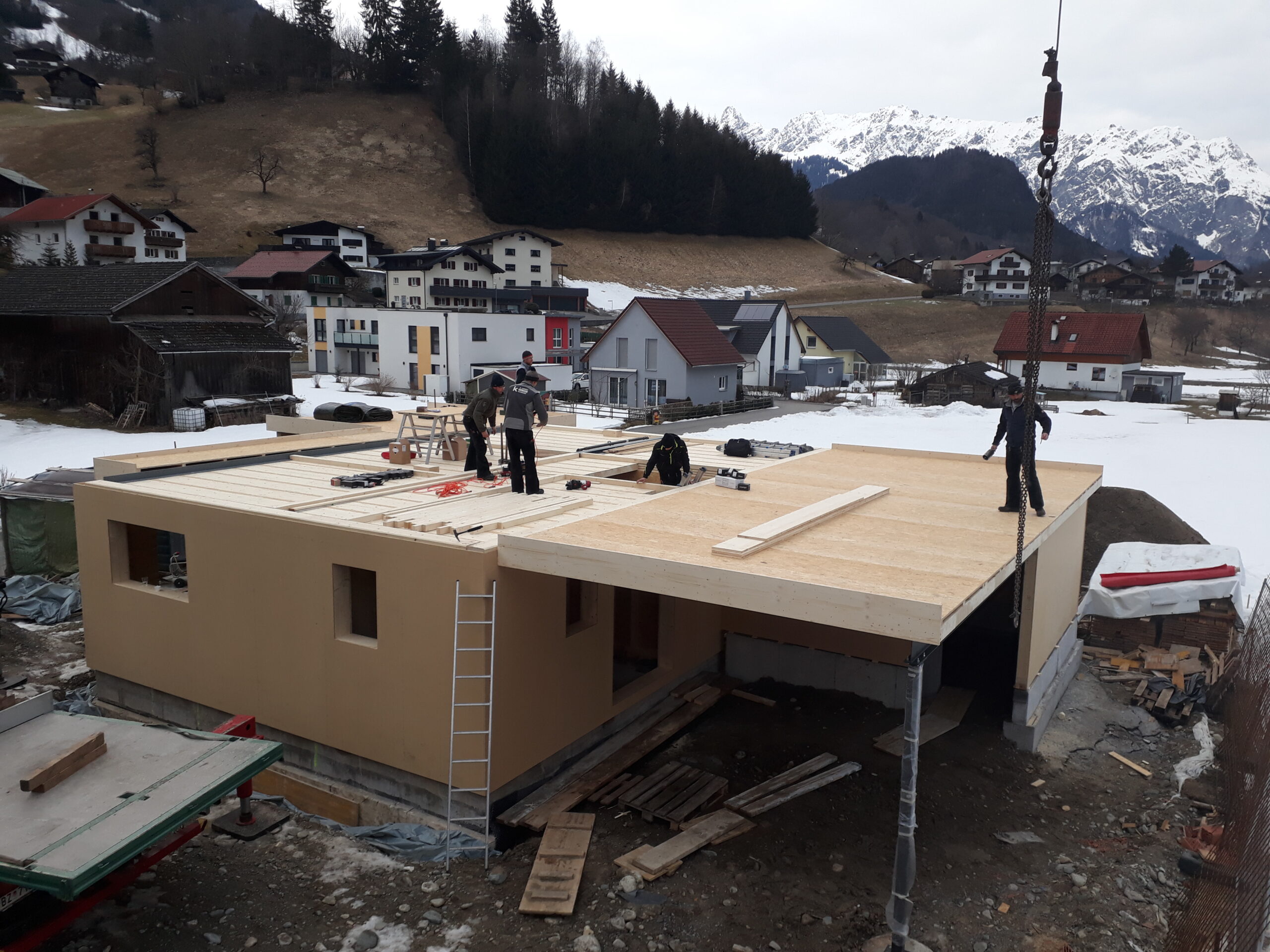 Untergeschoss in Stahlbeton, Erd- u. Obergeschoss in Holzelementbauweise, Zwischendecke aus BSH Deckenelementen Sicht, Dachkonstruktion aus BSH Deckenelementen Sicht mit Steildachdämmung, Schindelfassade