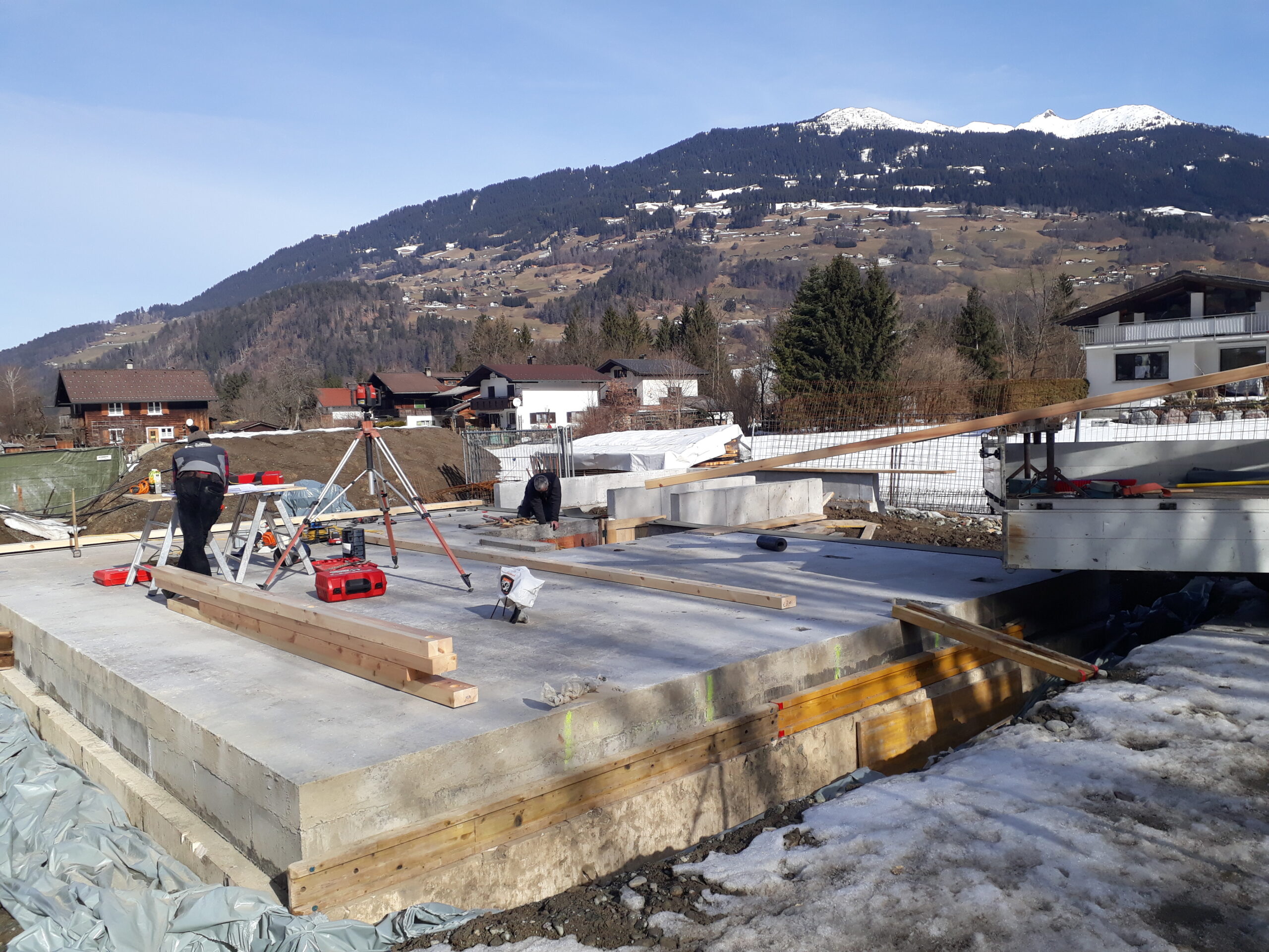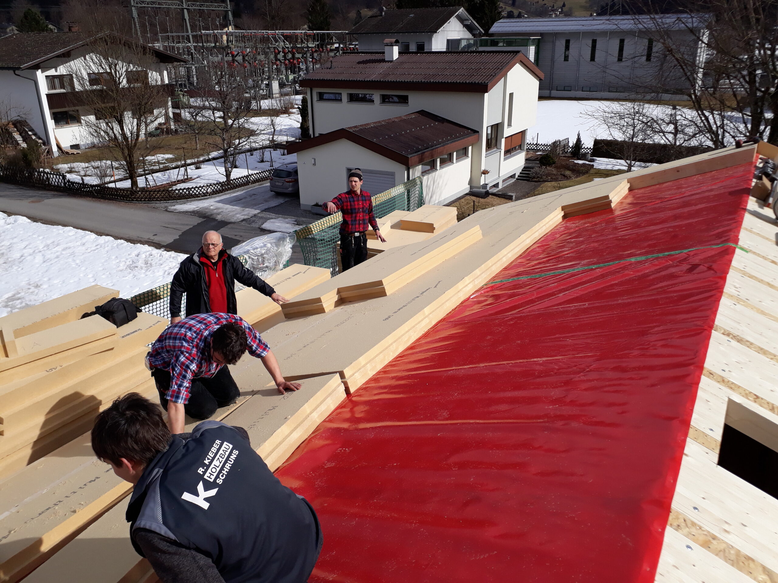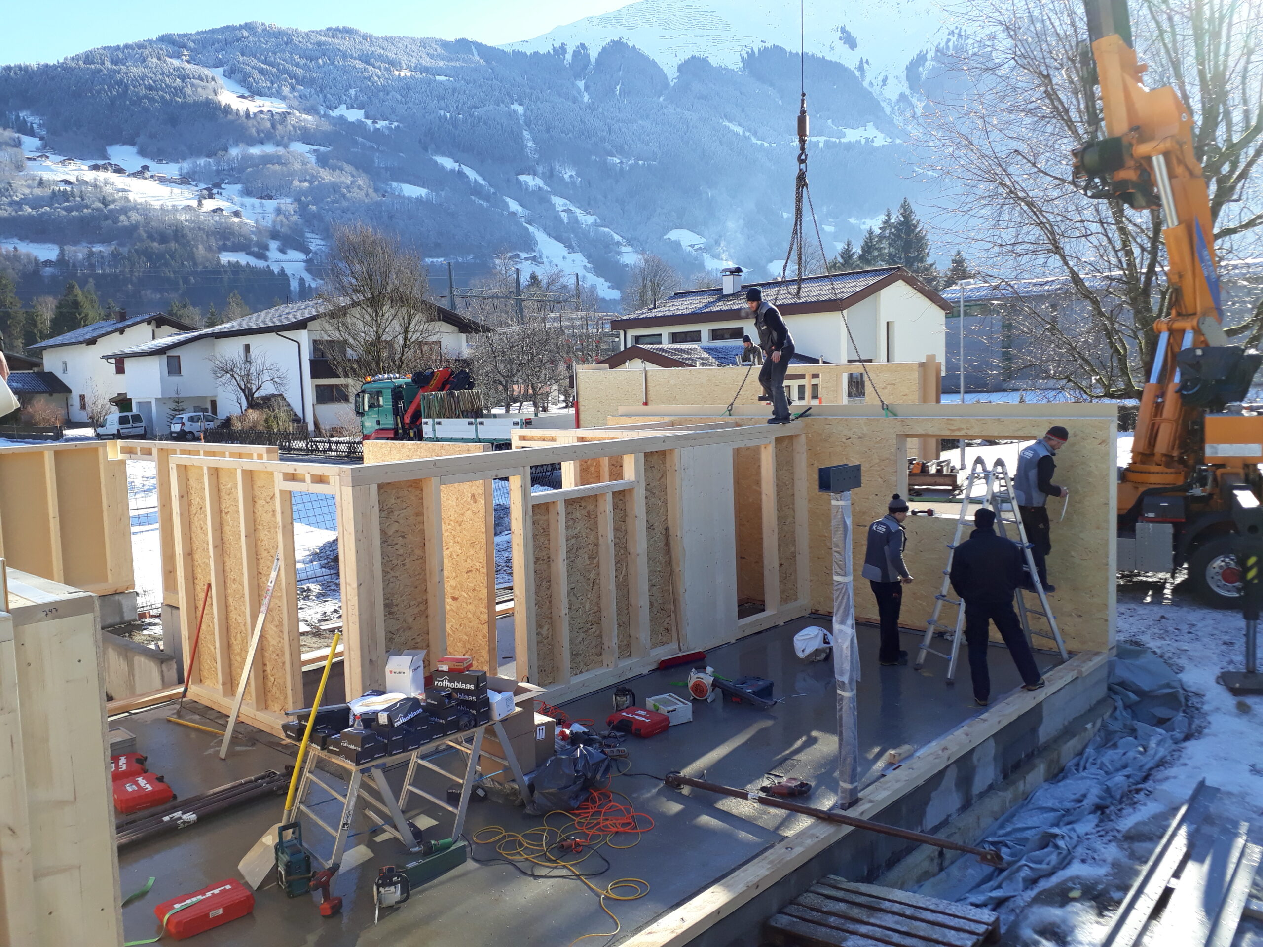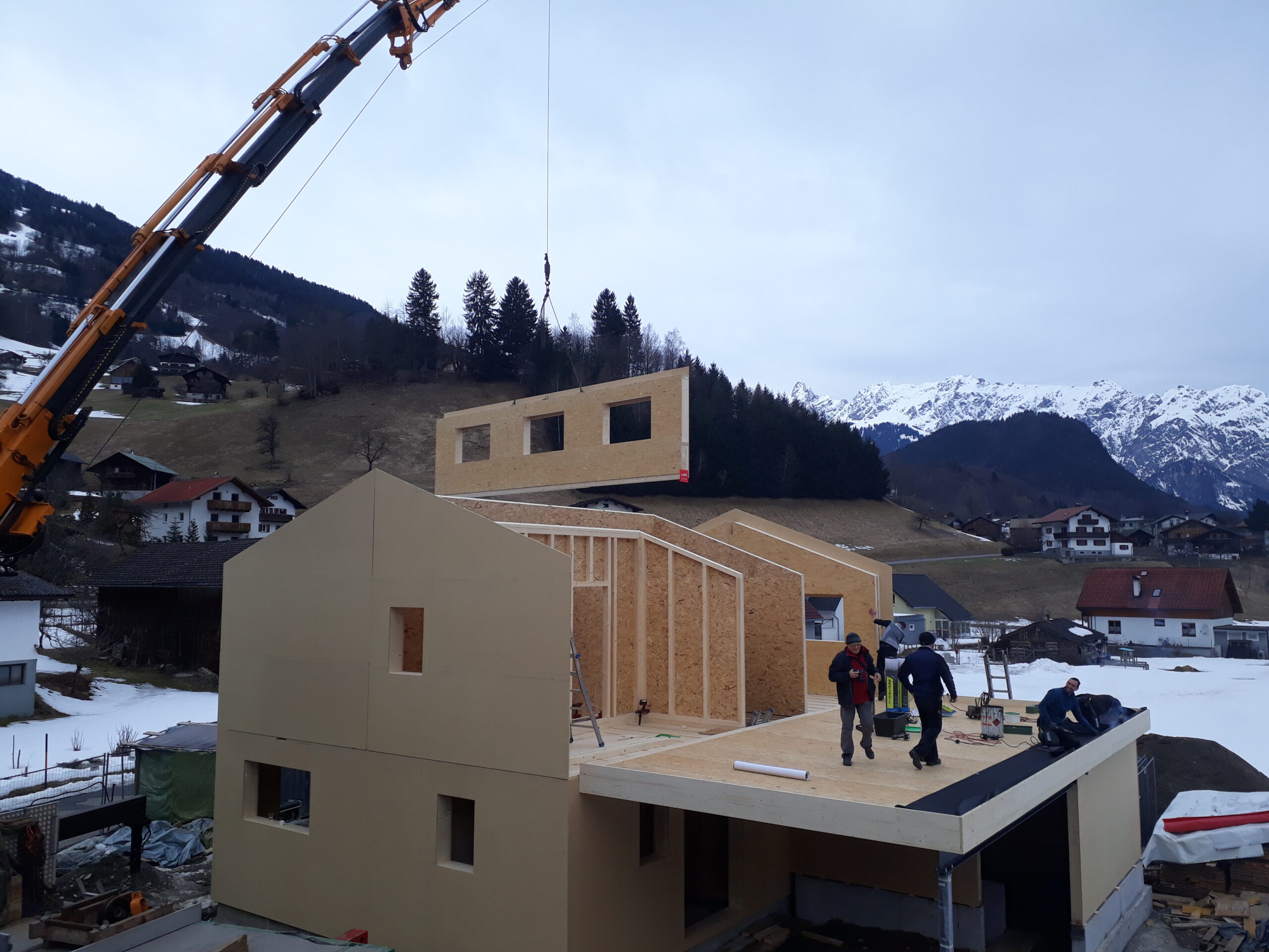 Untergeschoss in Stahlbeton, Erd- u. Obergeschoss in Holzelementbauweise, Zwischendecke aus BSH Deckenelementen Sicht, Dachkonstruktion aus BSH Deckenelementen Sicht mit Steildachdämmung, Schindelfassade