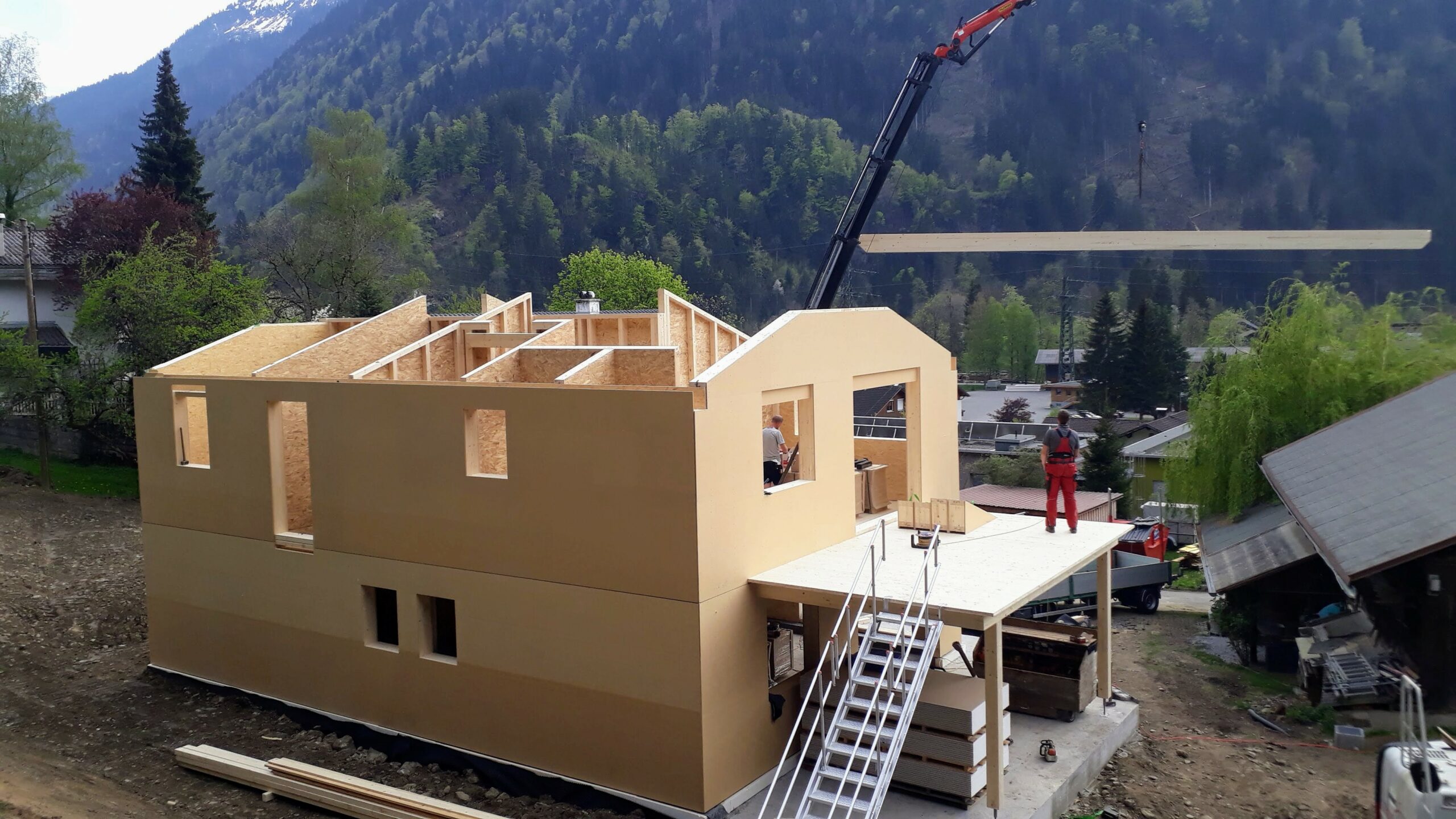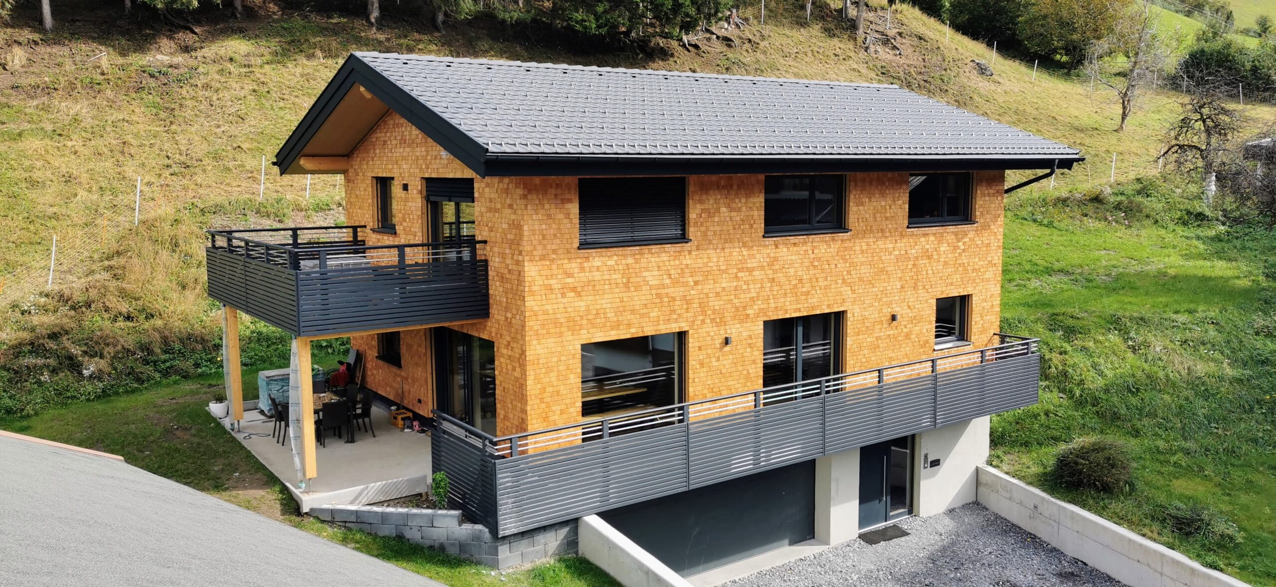 Untergeschoss in Stahlbeton, Obergeschosse in Holzelementbauweise, Zwischendecke in BSH Deckenelementen Sicht, Dachkonstruktion in BSH Deckenelementen Sicht mit Steildachdämmung und Ziegel Deckung, Schindelfassade