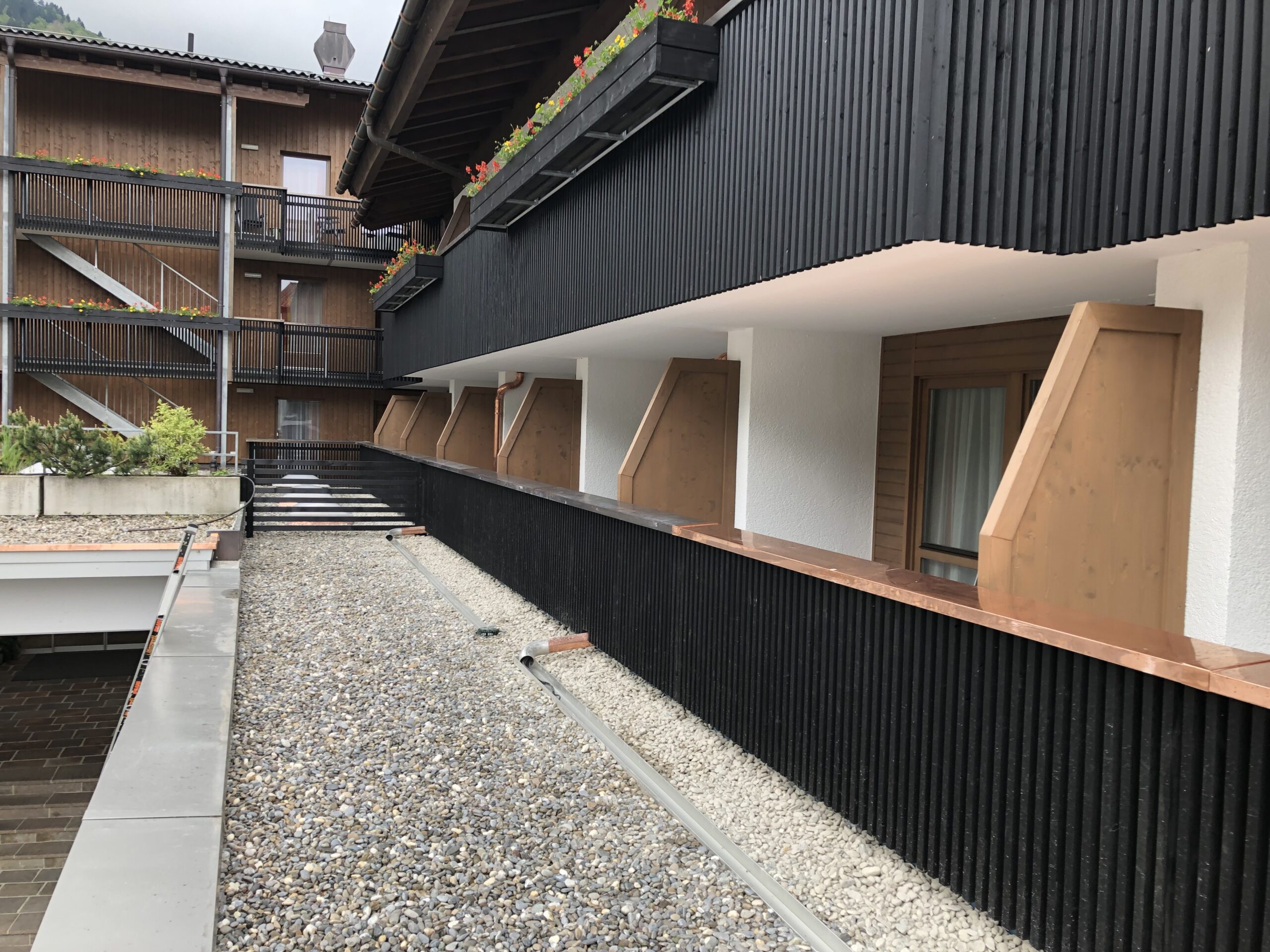 Auf bestehende Dämm- bzw. Putzfassade wurde eine neue vertikal Holzfassade angebracht, graubraun lasiert, Erneuerung der bestehenden Balkongeländer