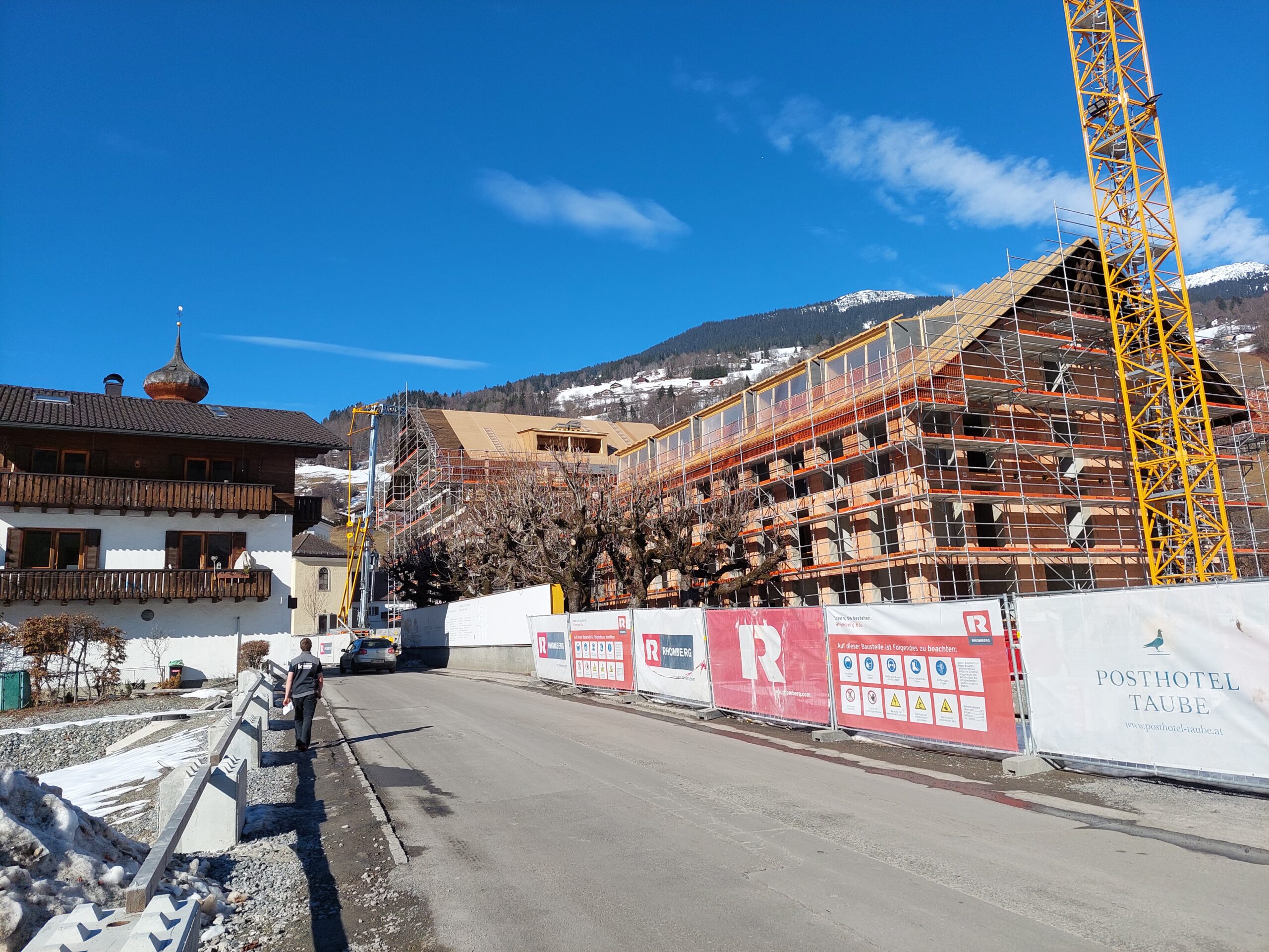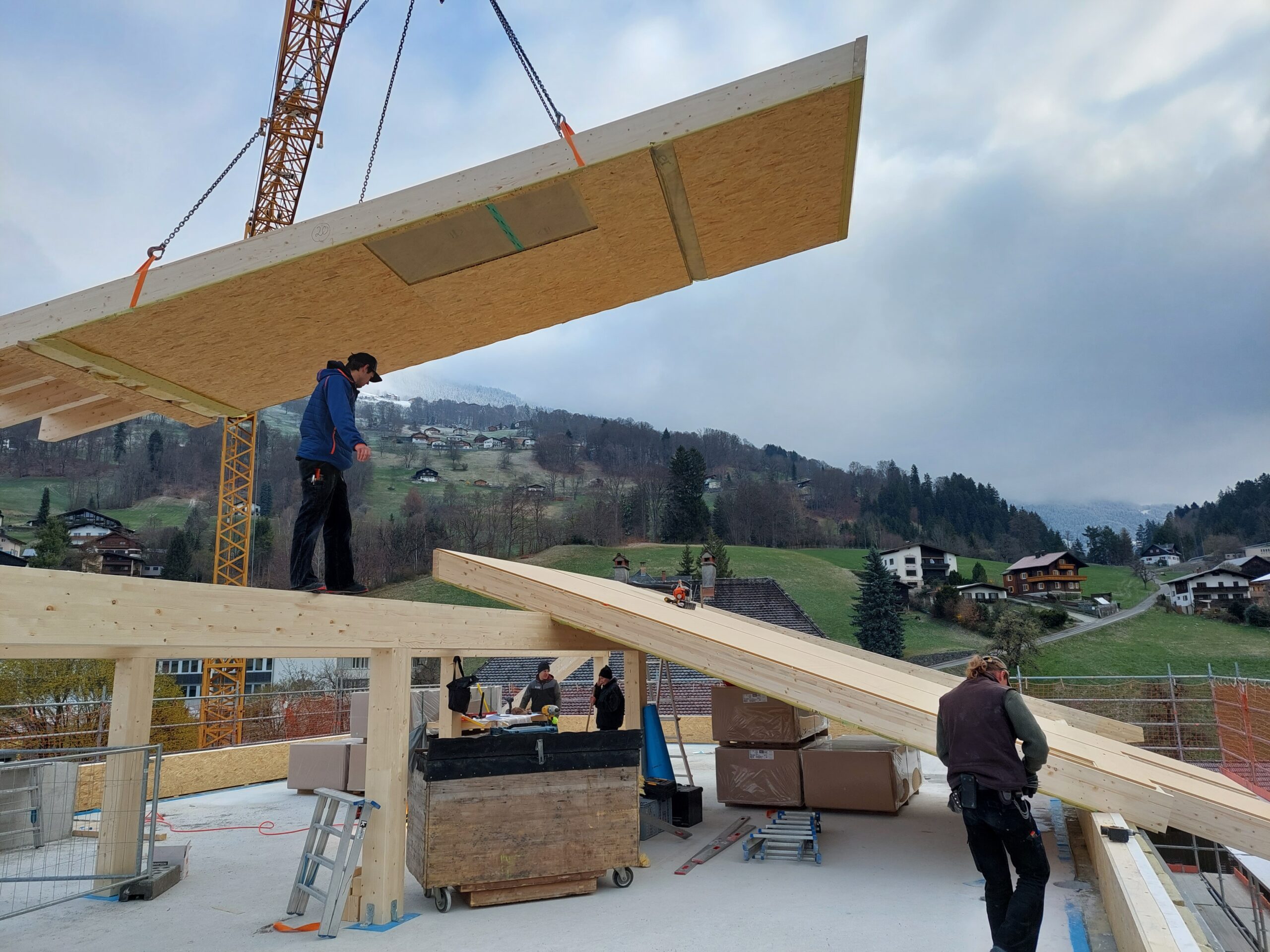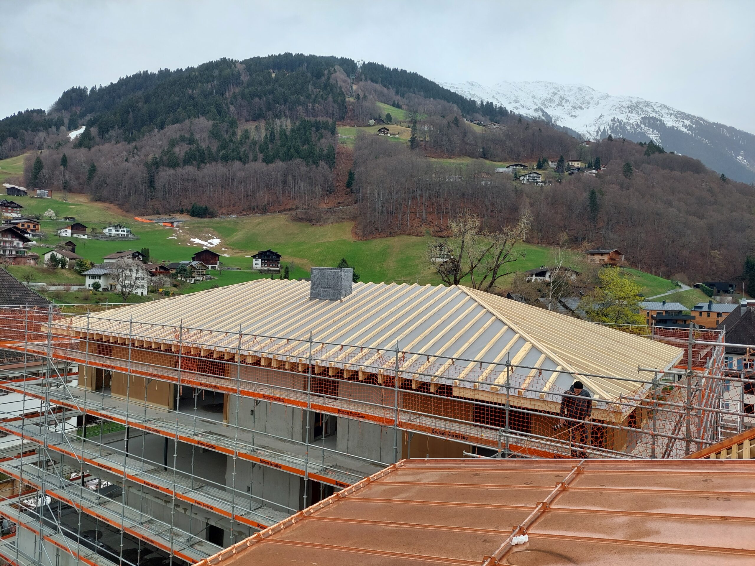 Beim Nebengebäude „Alpgues“ haben wir die Dachkonstruktion, Außenwände in Holzelementbauweise, Fassade Fichte lassiert, sowie die Balkonkonstruktion incl. Rost ausgeführt.