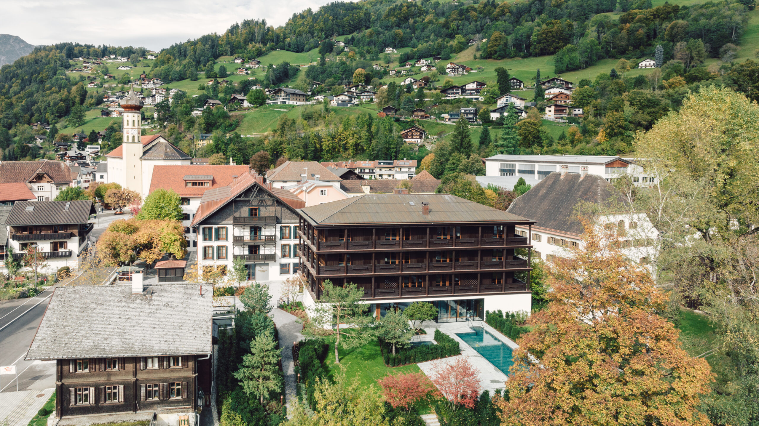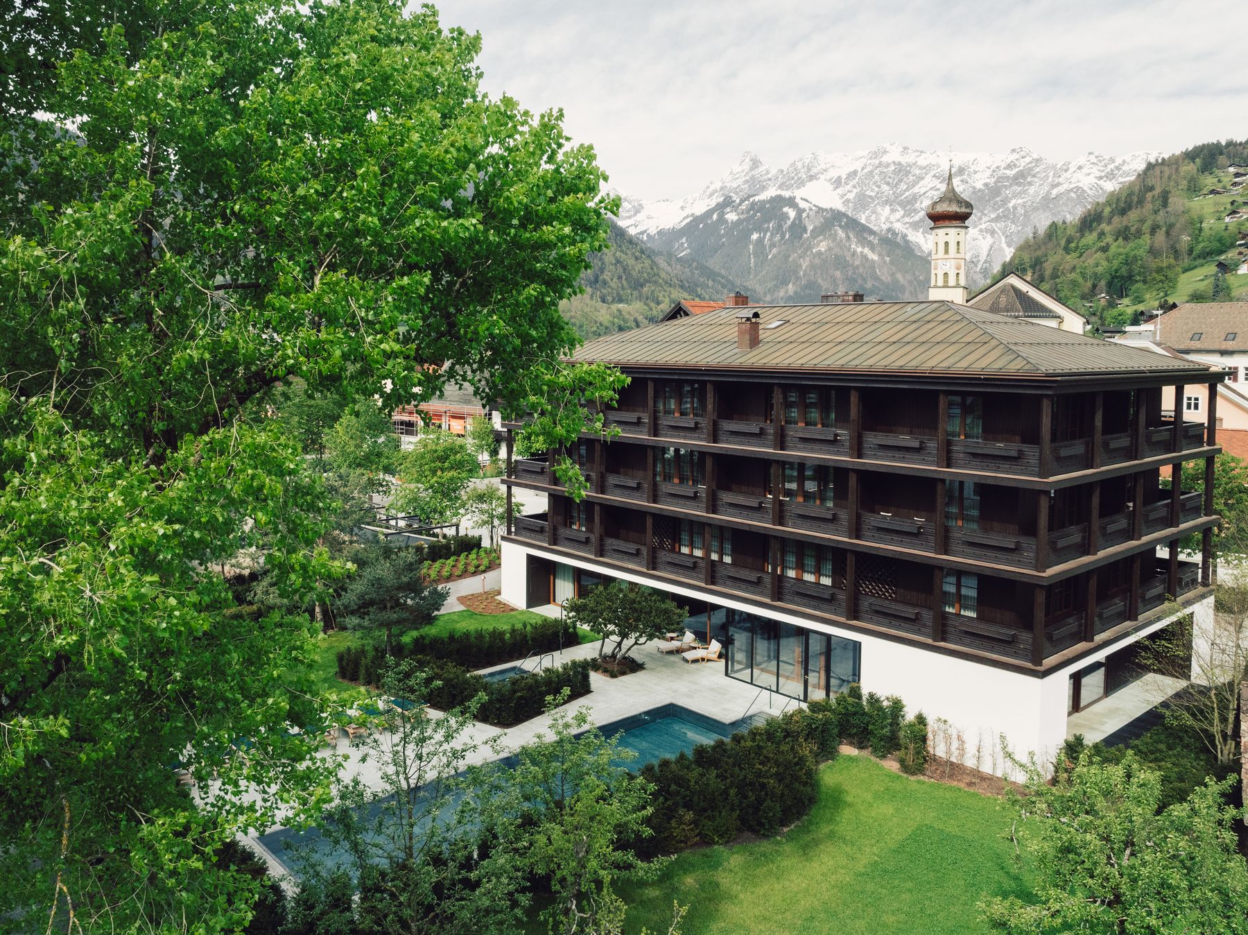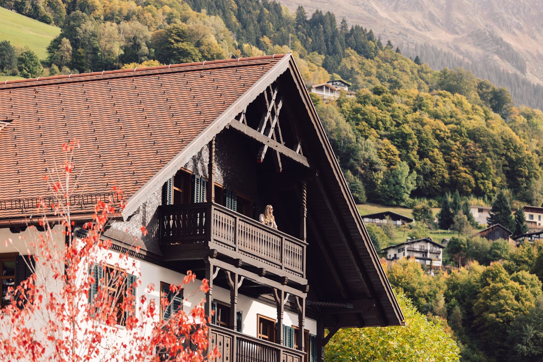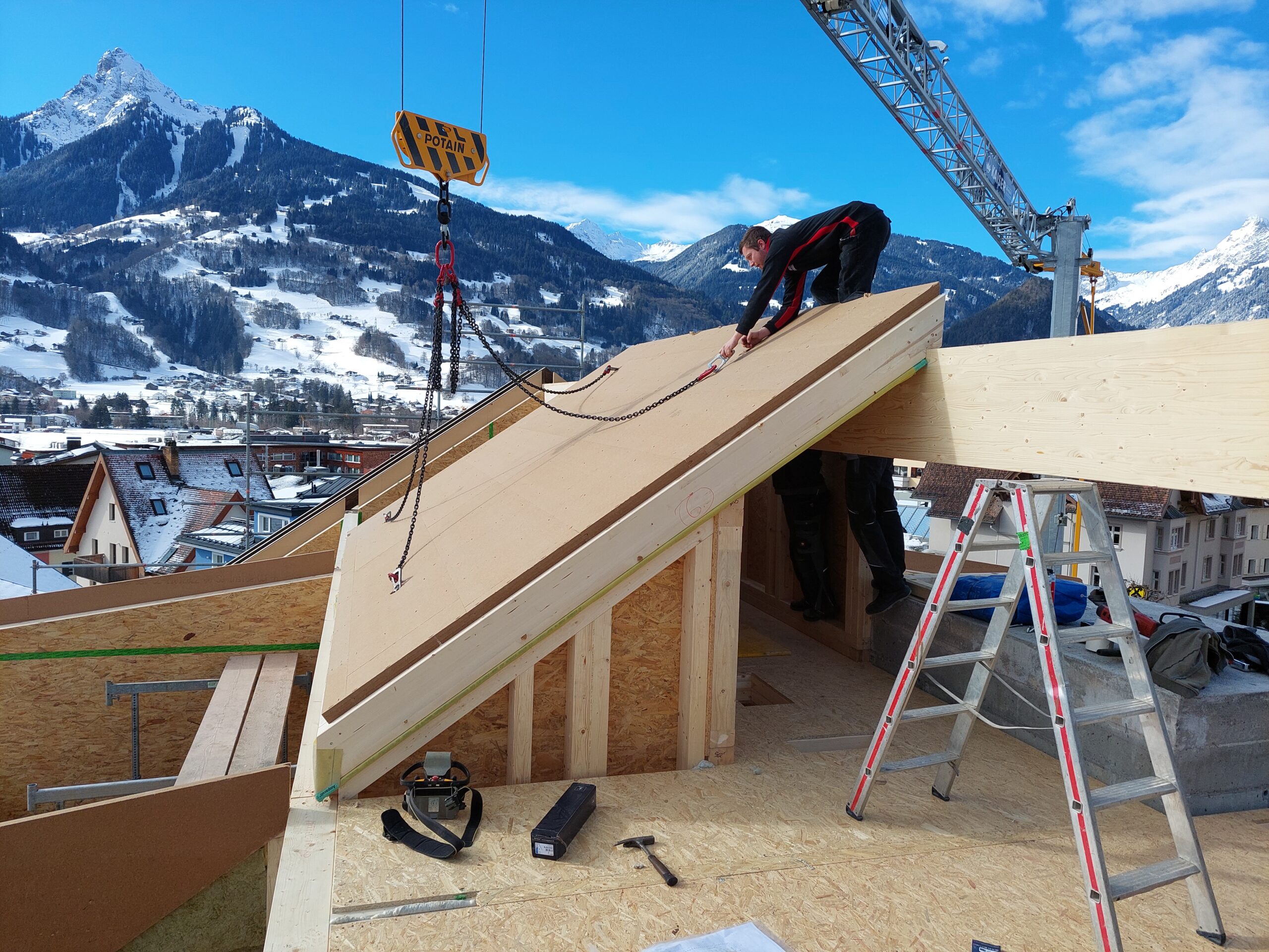 Beim Nebengebäude „Alpgues“ haben wir die Dachkonstruktion, Außenwände in Holzelementbauweise, Fassade Fichte lassiert, sowie die Balkonkonstruktion incl. Rost ausgeführt.