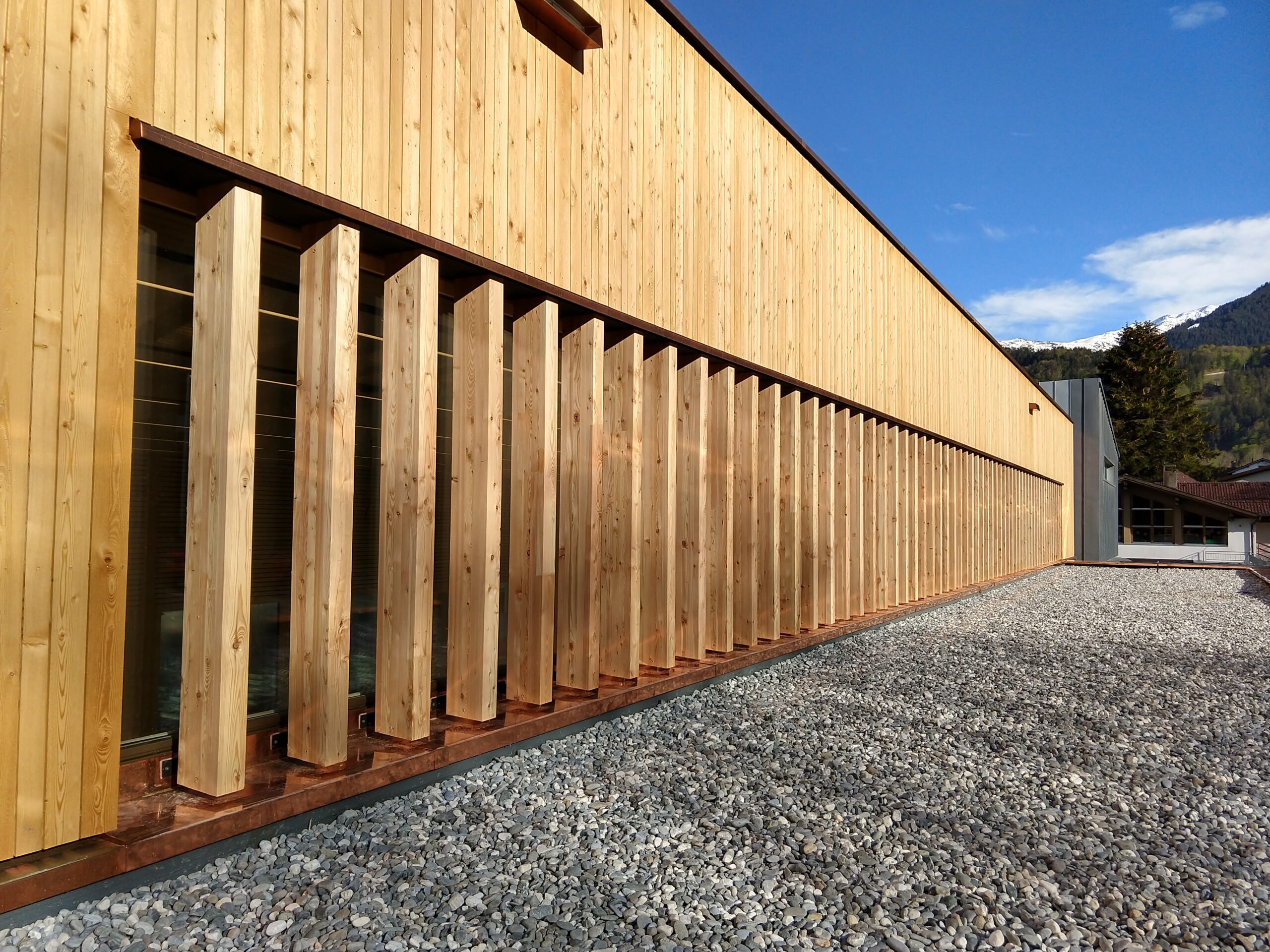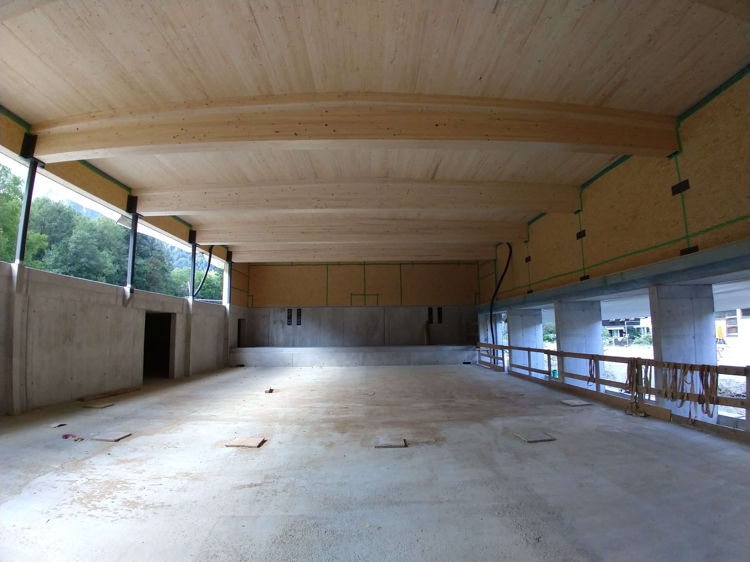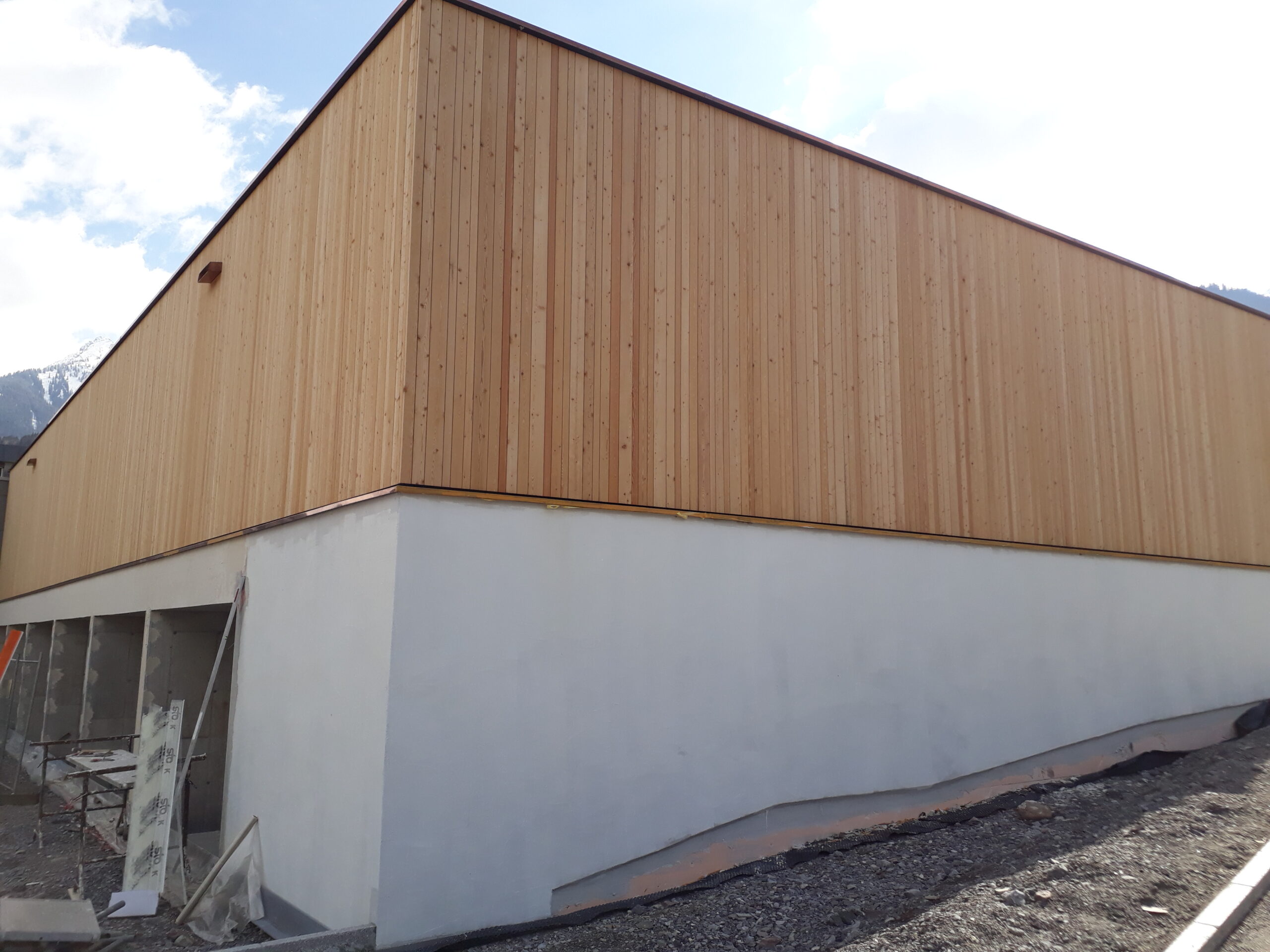 Bodenplatte Wände im unteren Teil aus Stahlbeton, Außen- u. Innenwände in Holzelementbauweise, statisch aussteifende Stahlkonstruktion in den Wänden integriert, Tragkonstruktion des Daches aus Brettschichtholzträger sowie Brettsperrholzplatten, Außenfassade in Lärche natur, Innenwand- und Deckenverkleidung in Weißtanne