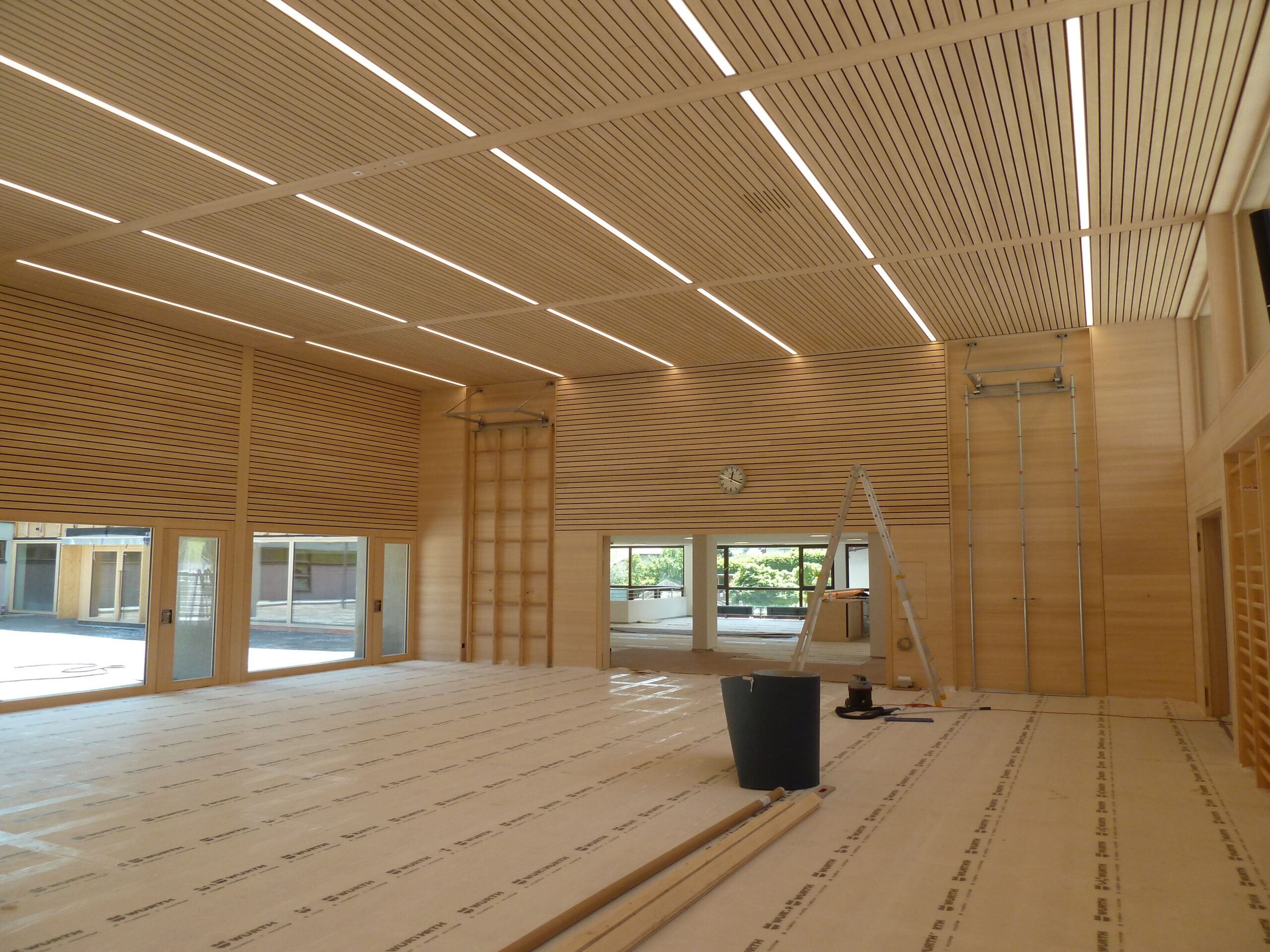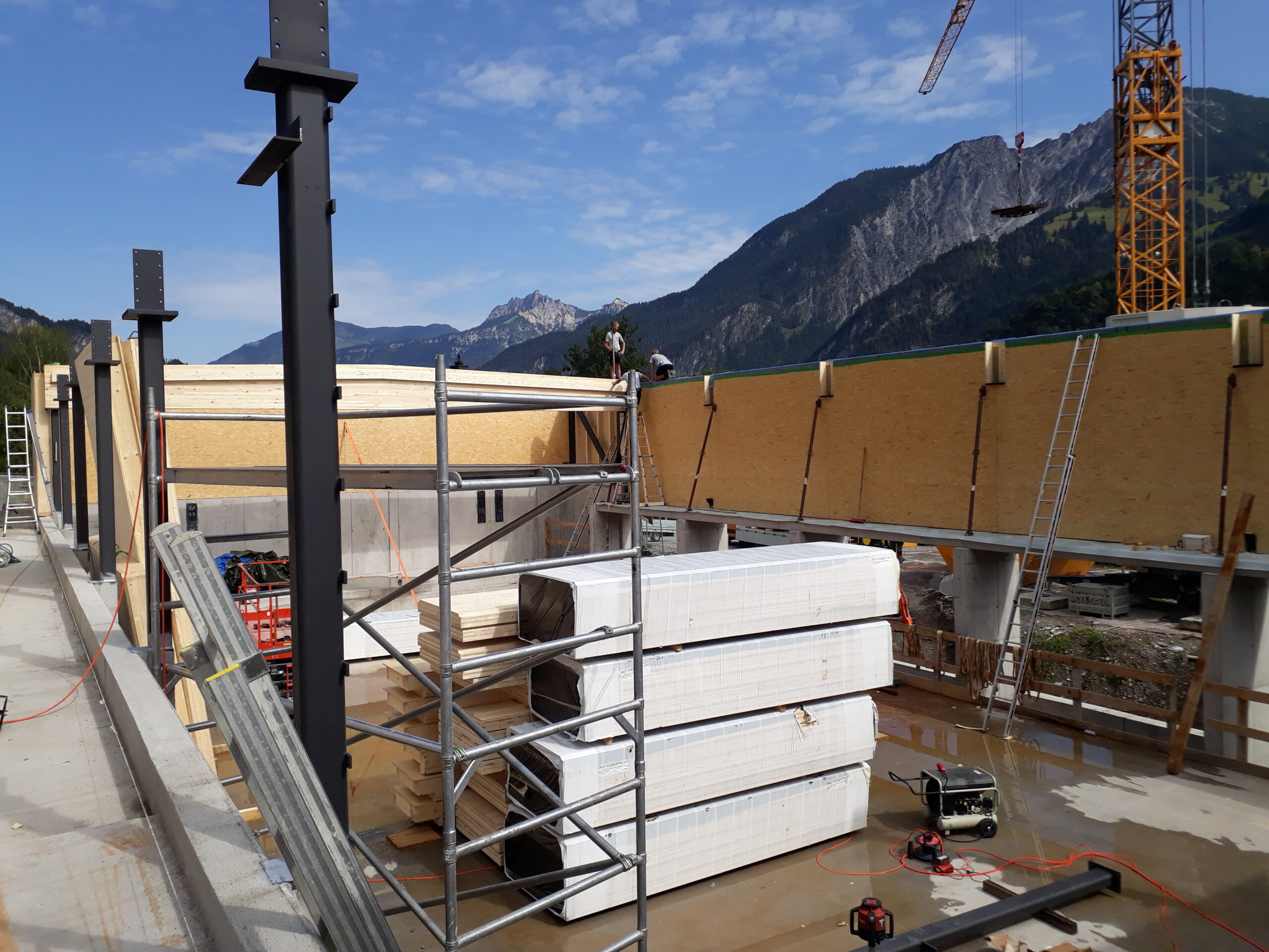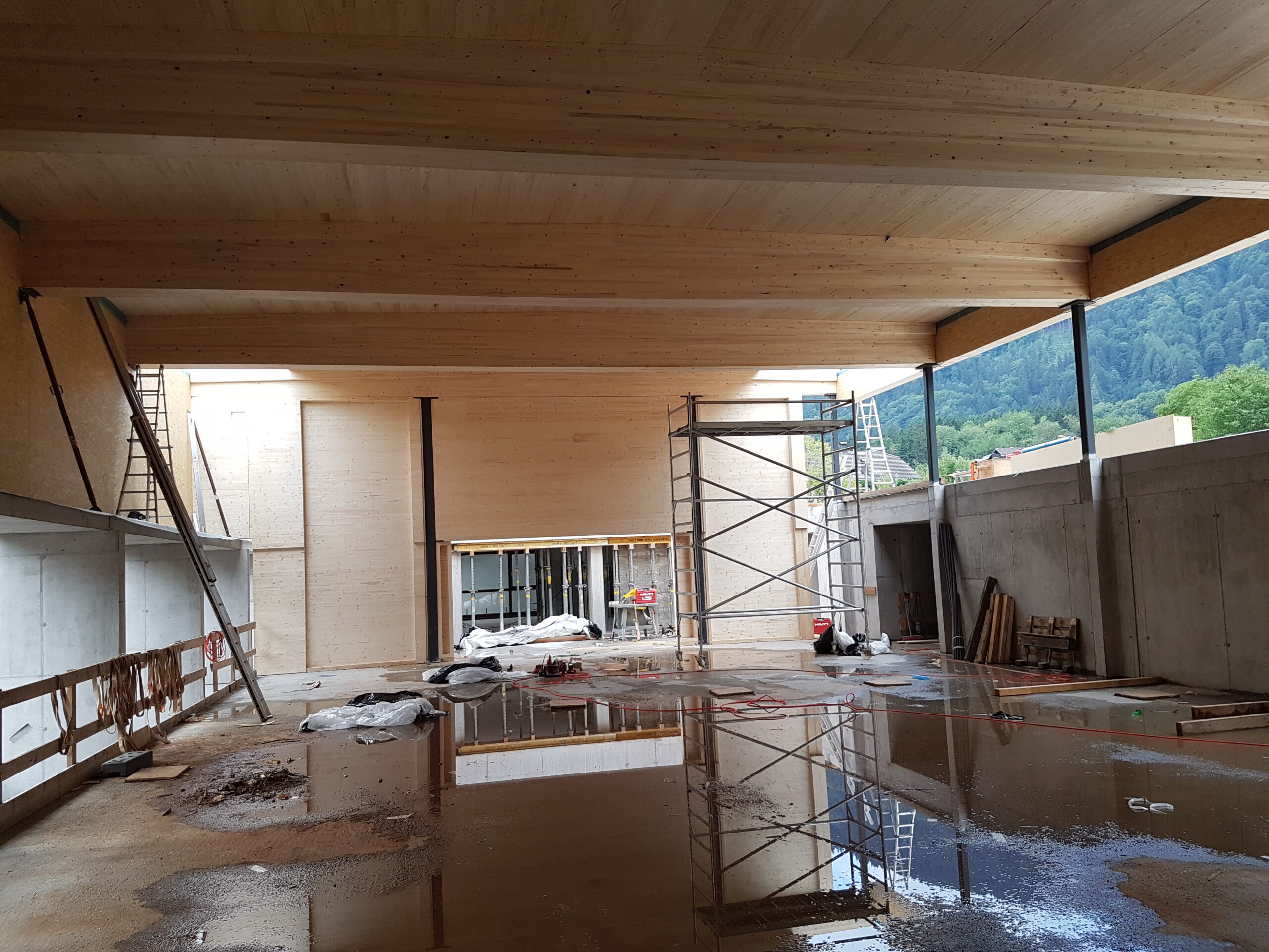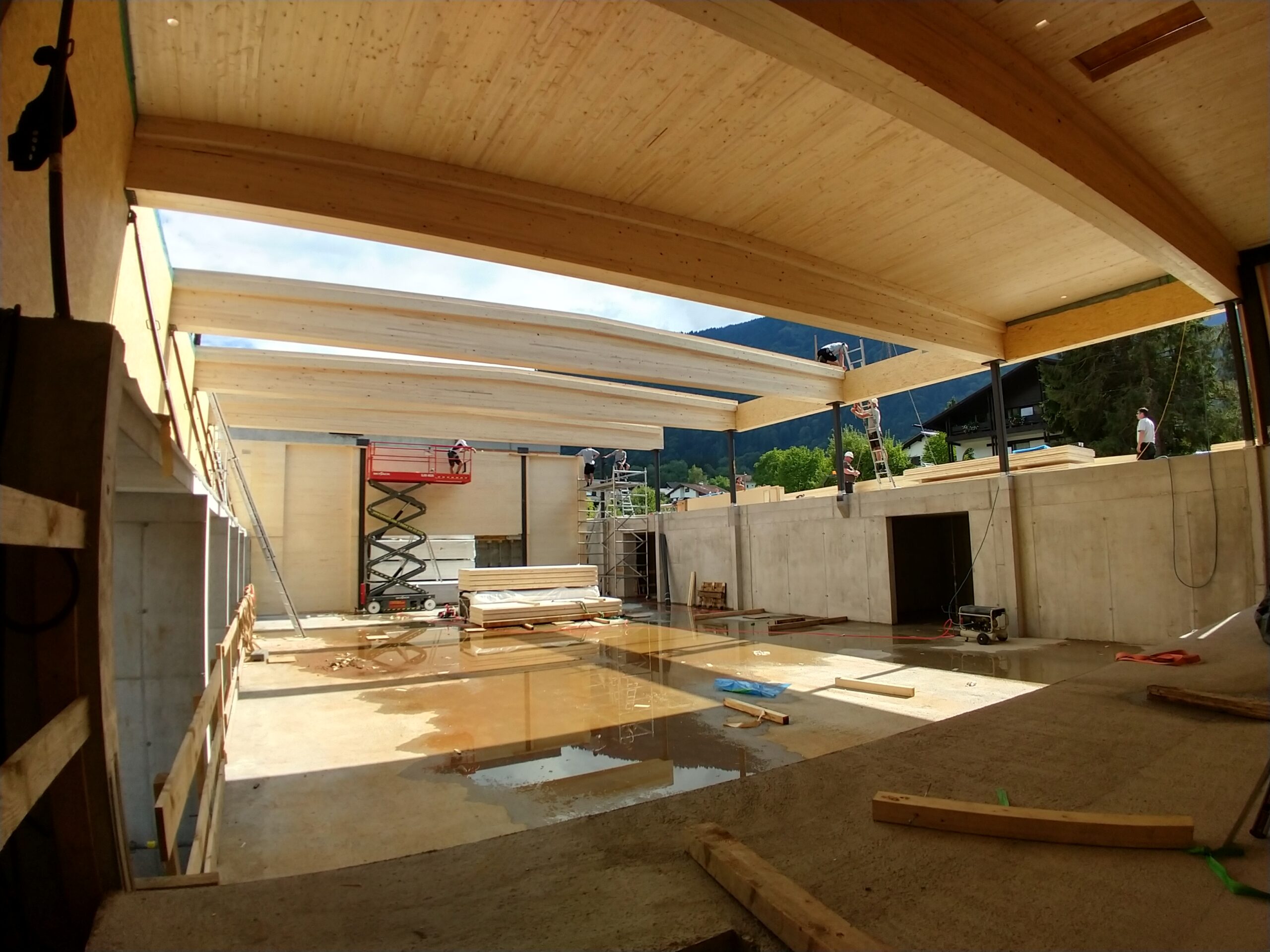 Bodenplatte Wände im unteren Teil aus Stahlbeton, Außen- u. Innenwände in Holzelementbauweise, statisch aussteifende Stahlkonstruktion in den Wänden integriert, Tragkonstruktion des Daches aus Brettschichtholzträger sowie Brettsperrholzplatten, Außenfassade in Lärche natur, Innenwand- und Deckenverkleidung in Weißtanne