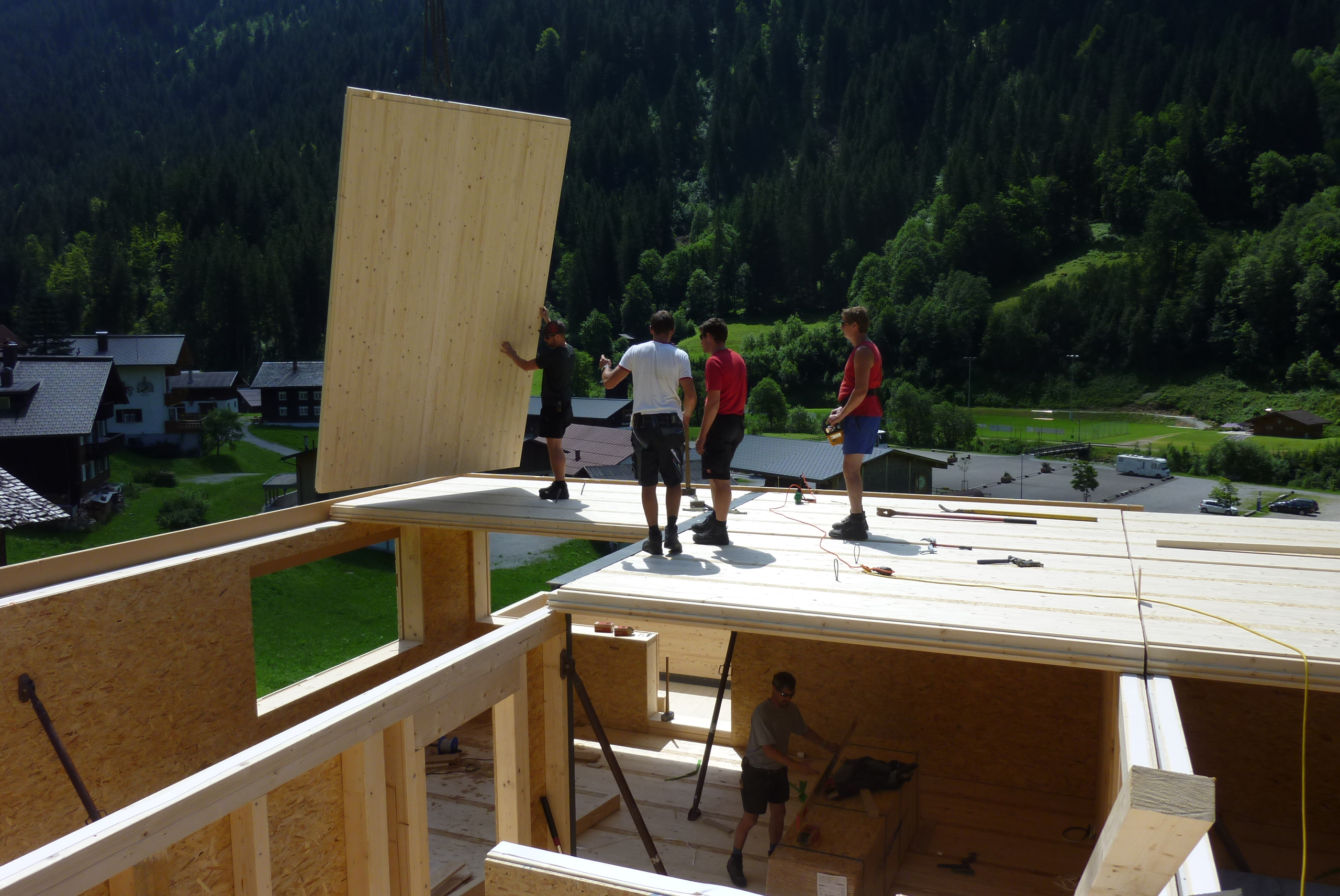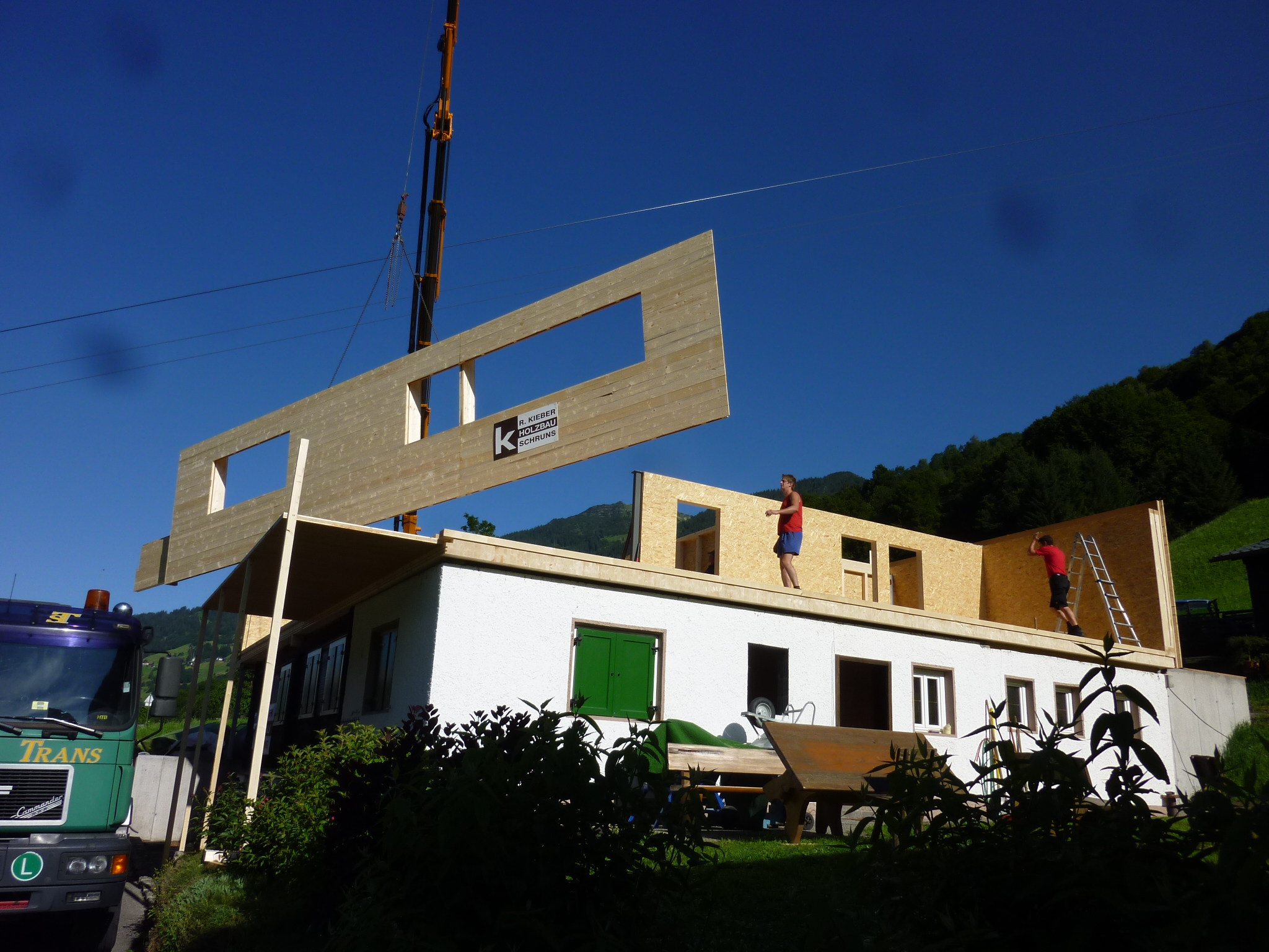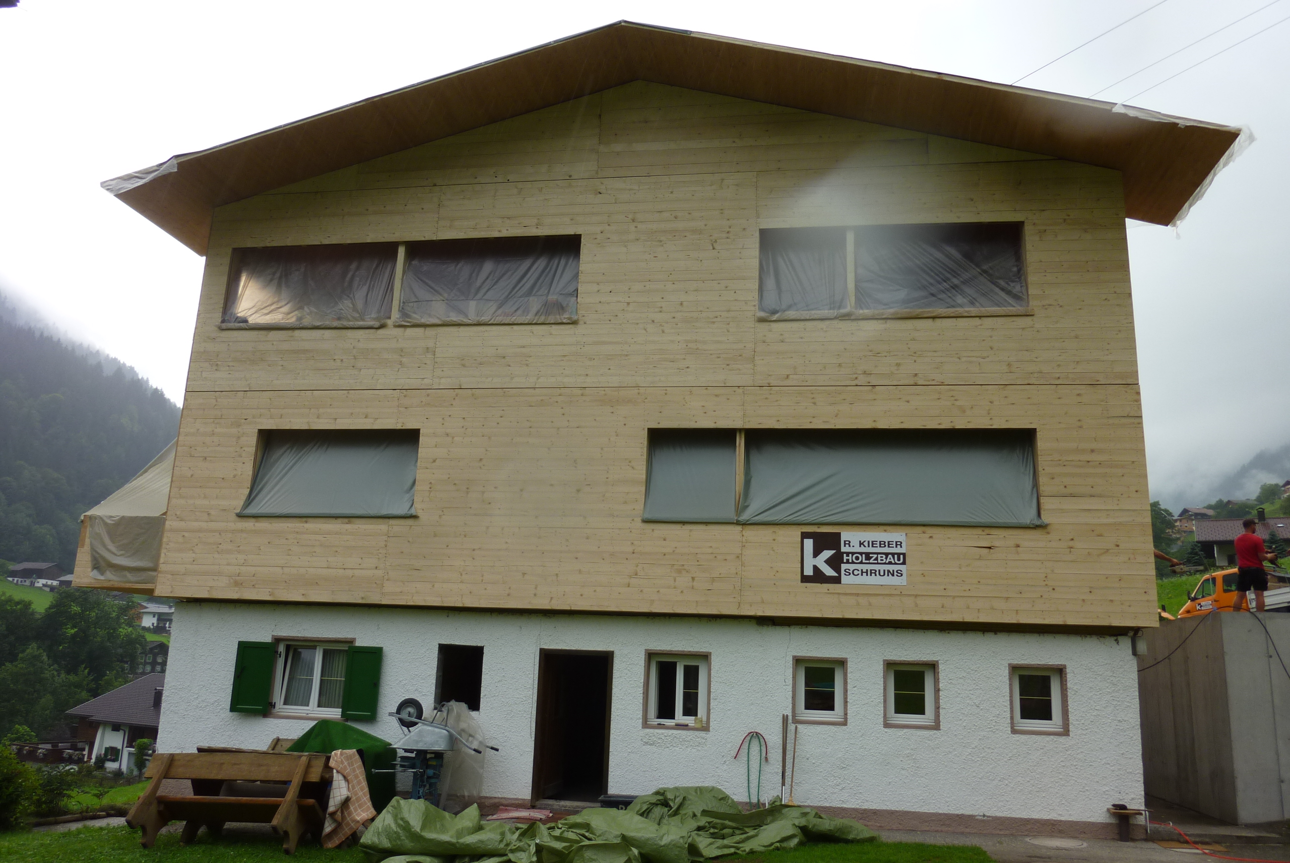 Das Ober- und Dachgeschoss des bestehenden Gebäudes wurden abgetragen und neu aufgebaut. Außenwände in Holzelementbauweise, Zwischendecke aus BSH Deckenelementen Sicht, Dachkonstruktion aus BSH Deckenelementen Sicht, Dachkonstruktion in Multiboxelementen, Schindelfassade