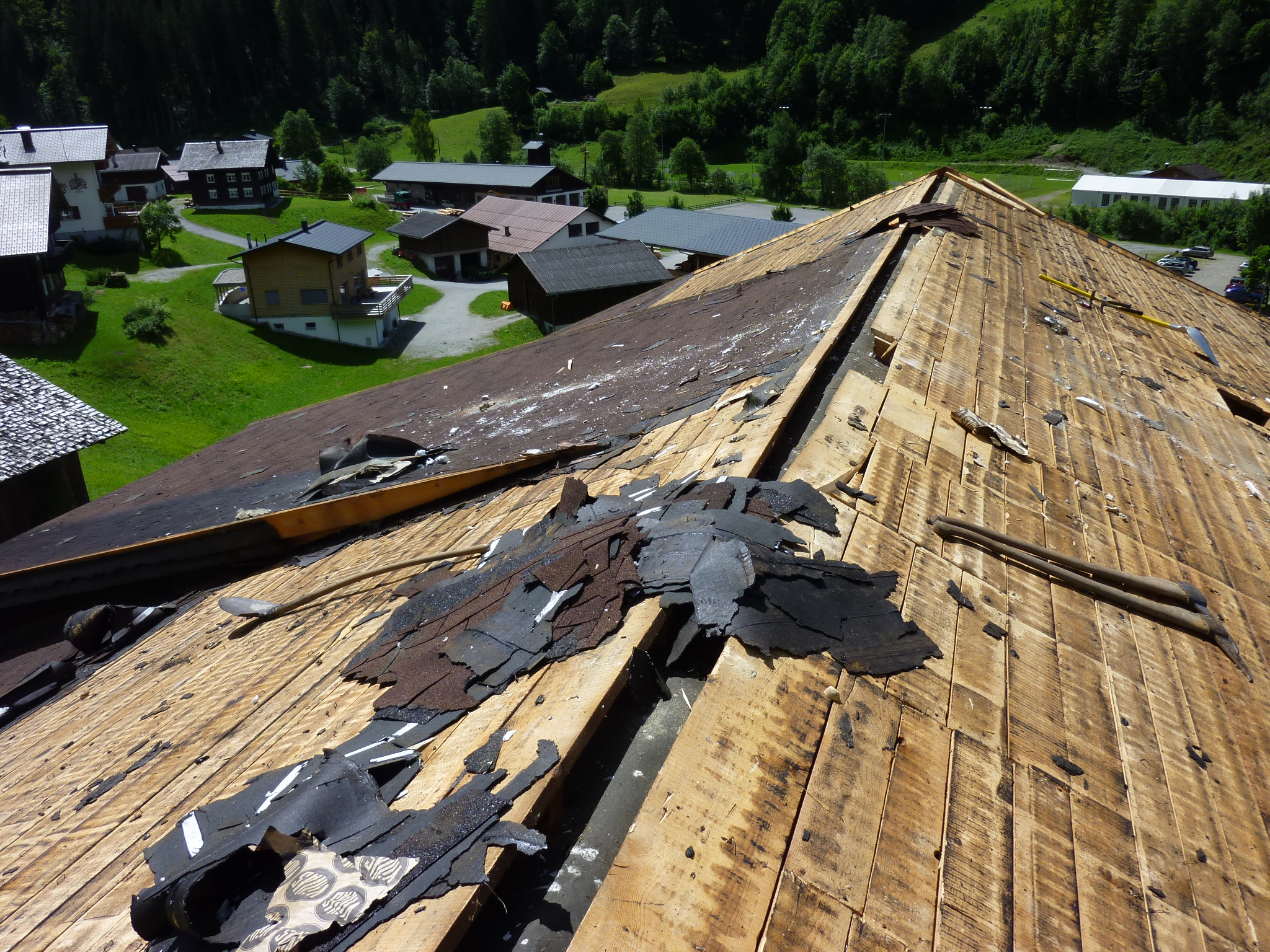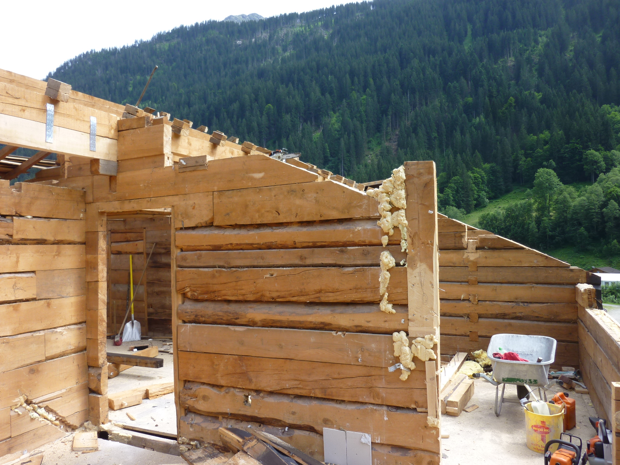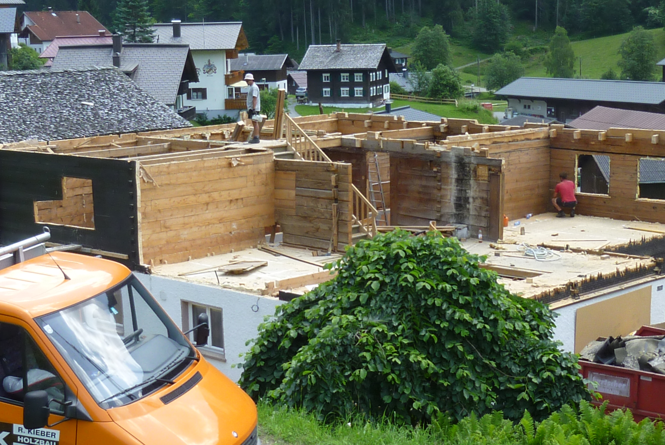 Das Ober- und Dachgeschoss des bestehenden Gebäudes wurden abgetragen und neu aufgebaut. Außenwände in Holzelementbauweise, Zwischendecke aus BSH Deckenelementen Sicht, Dachkonstruktion aus BSH Deckenelementen Sicht, Dachkonstruktion in Multiboxelementen, Schindelfassade